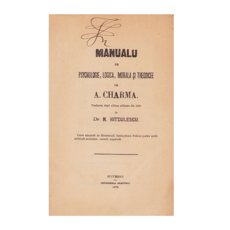 A. Charma, Manual de psihologie, logică, morală și theodicee, traducere de dr. N. Nitzulescu, București, Imprimeria Statului, 1870. IX, 183 p.