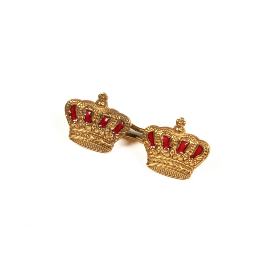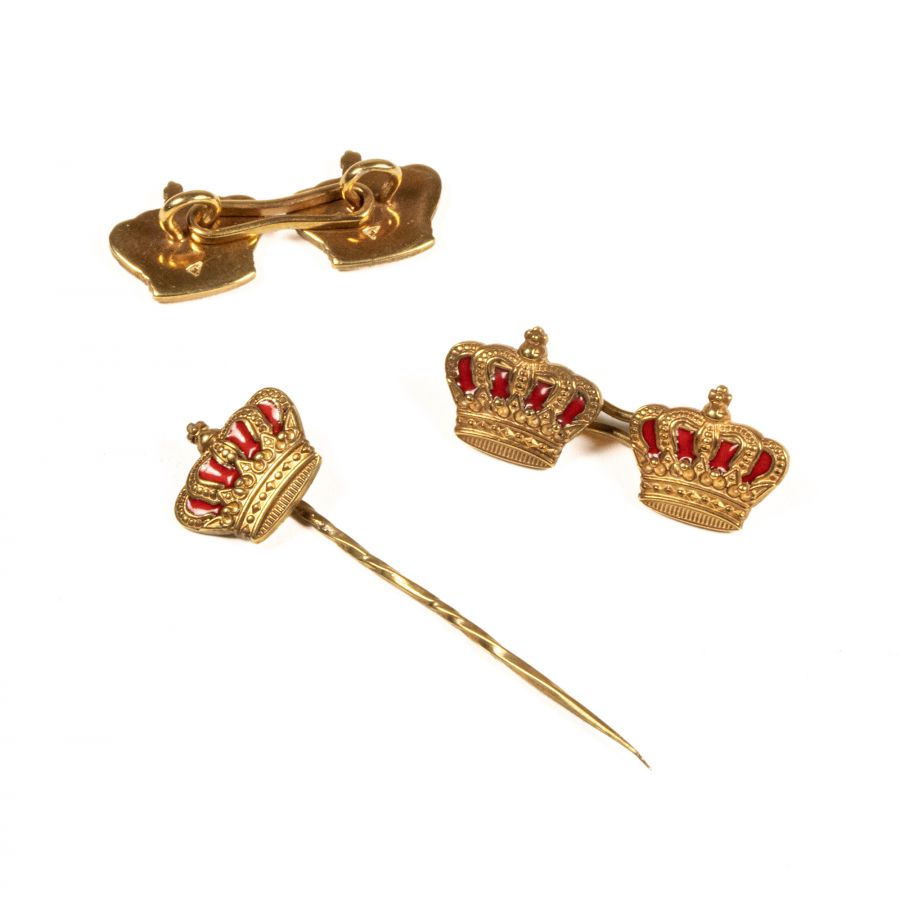 Set de butoni și ac de rever realizați din argint aurit cu simbolul coroanei României, decorată cu email roșu. Pe reversul acului și al butonilor regăsim marcajul argintului.