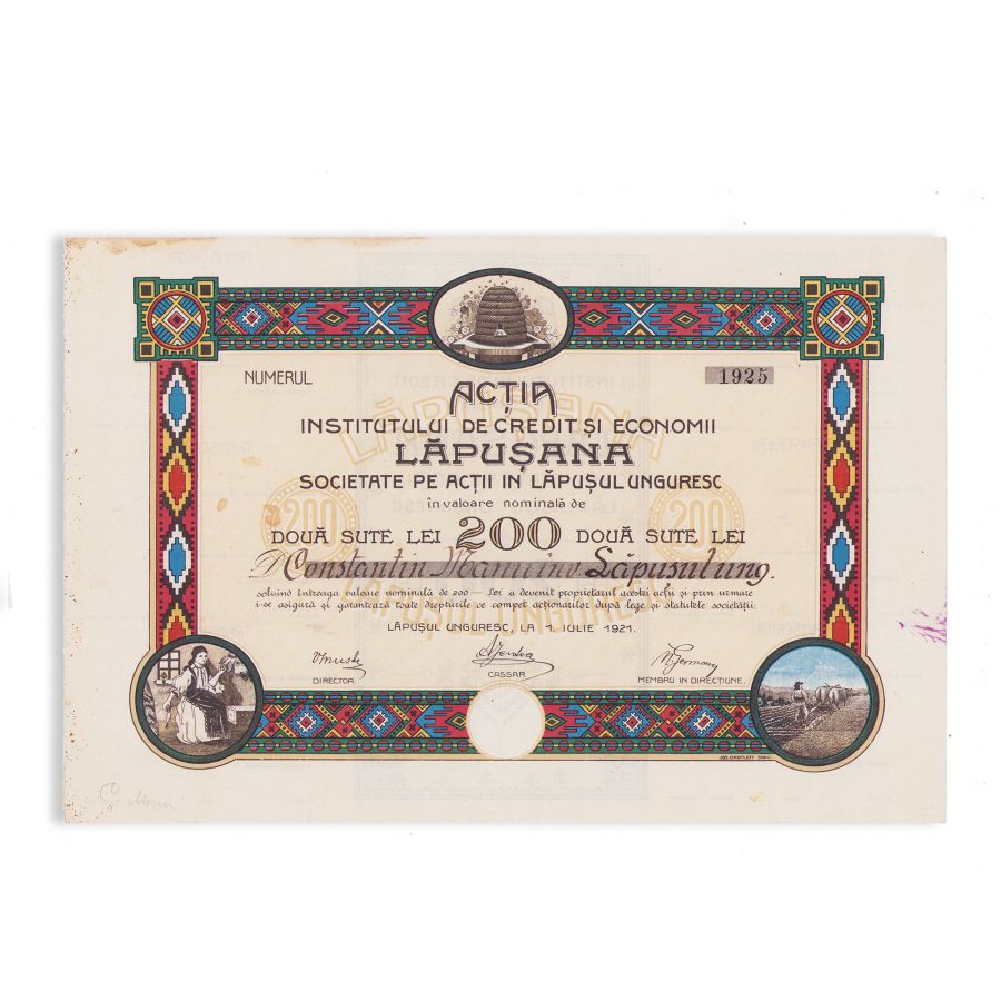 Acția Institutului de Credit și Economii „Lăpușana”, Societate pe acții în Lăpușul Unguresc, în valoare de 200 lei, emisă pe numele învățătorului Constantin Manu. Aceasta este datată 1921 și poartă un talon cu 24 cupoane.