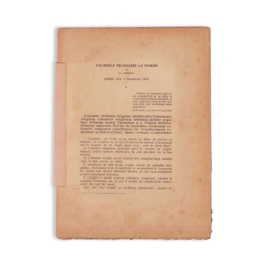 Al. Rosetti, Colindele religioase la români, Extras din Analele Academiei Române, Tom. XL, Memoriile Secției Literare, București, Monitorul Oficial și Imprimeriile Statului, 1919, 79 p.