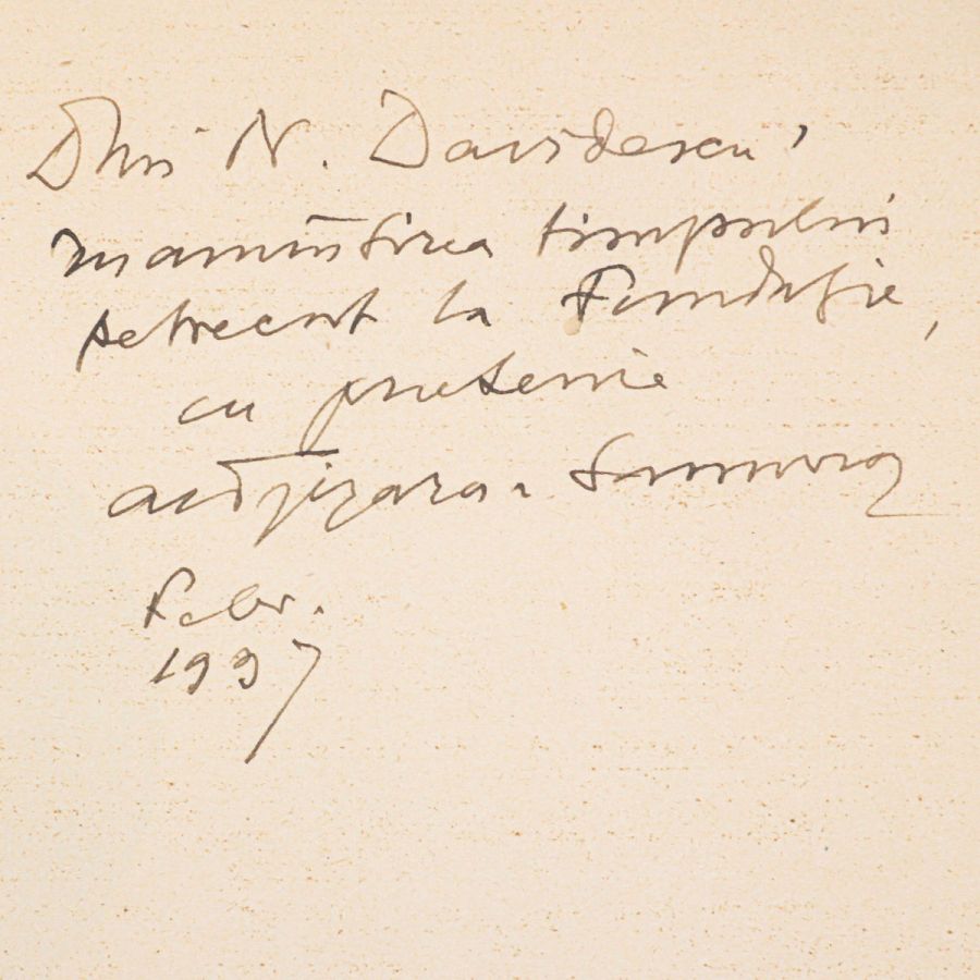 Volumul poartă dedicația olografă a autorului oferită prietenului său N. Davidescu „în amintirea timpului petrecut la fundație”, datată 1937.