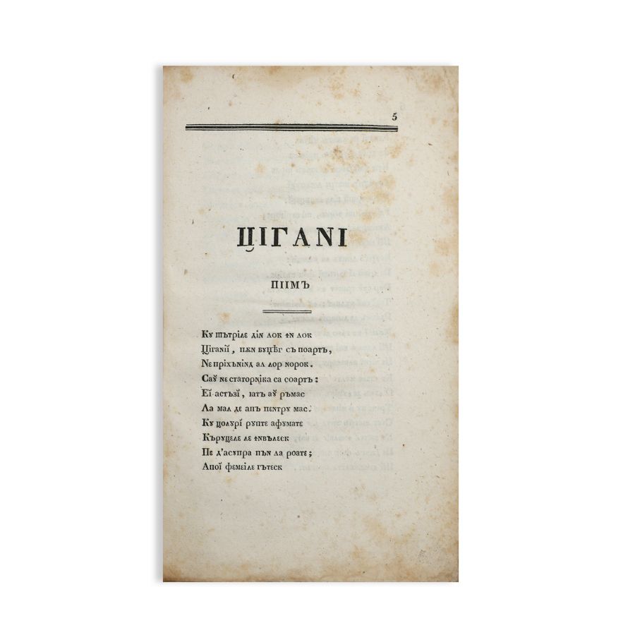 Aleksandr Pușkin, Țiganii, tălmăcită din limba rusească de Alexandru Donici, Bucureşti, Tipografia lui Eliad, 1837, 24 p.
