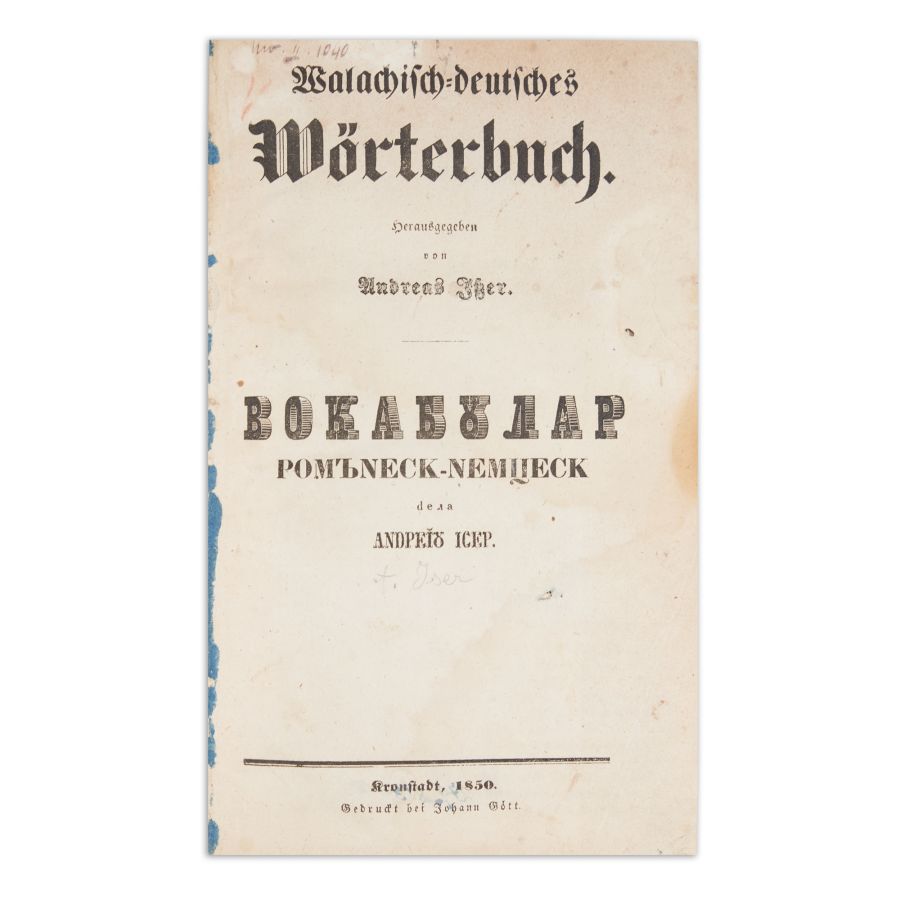 Andreas Iser, Vocabular românesc-nemțesc [Walachisch-Deutsches Worterbuch], Sibiu, Johann Gott, 1850, 274 p.