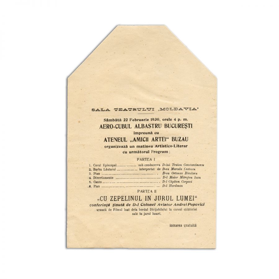 Programul matineului artistico-literar organizat în data de 22 februarie 1930 în sala Teatrului Moldavia, în cadrul căruia colonelul-aviator Andrei Popovici a ținut o conferință intitulată „Cu zepelinul în jurul lumei”.