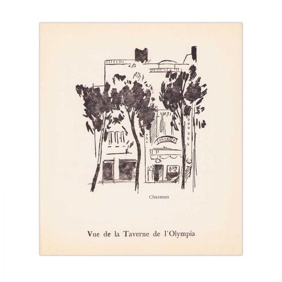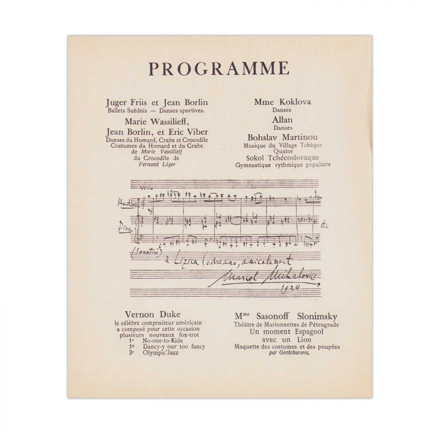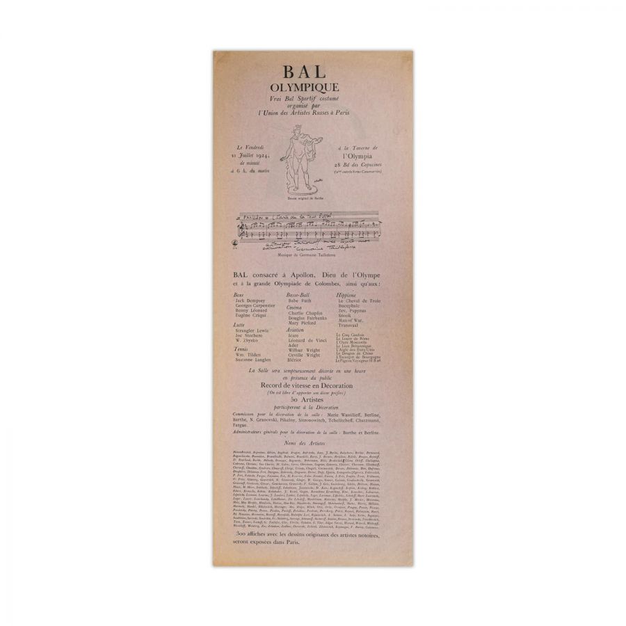 Invitație la balul mascat Bal olympique, (vrai bal sportif costumé le vendredi 11 Juillet 1924 de minuit à 6h du matin à la taverne de l'Olympia, 28 Bd des Capucines) organizat de Uniunea Artiștilor Ruși. Aceasta conține numele artiștilor care urmau să participe și un scurt program al evenimentului imprimat pe verso alături de o ilustrație de Natalija Gontscharova.