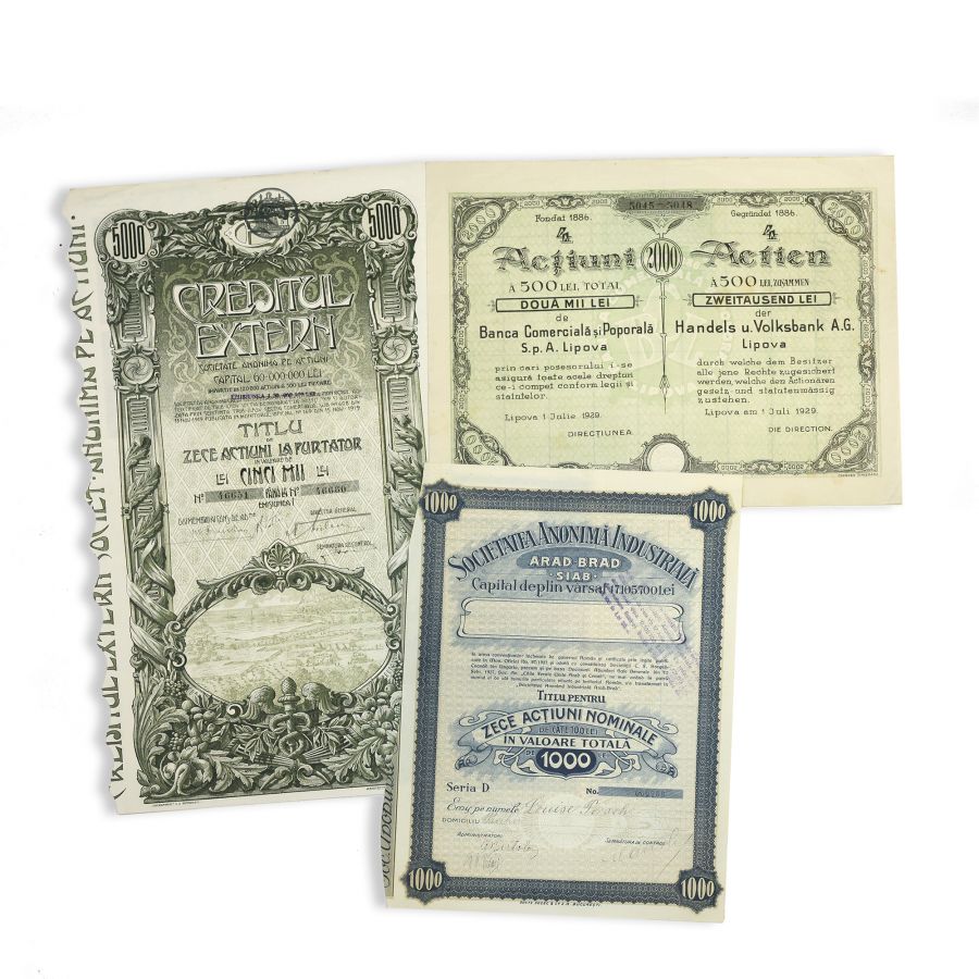 Patru acțiuni a 500 lei, în total 2000 lei, ale Băncii Comerciale și Populare din Lipova, datate 1 iulie 1929. Este bilingvă, în română și germană.