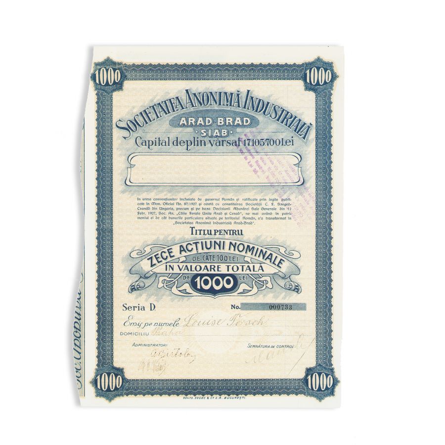 Titlu pentru zece acțiuni nominale de câte 100 lei, în valoare totală de 1000 lei, al Societății Anonime Industriale din Arad-Brad (SIAB), emis pe numele lui Louise Torsch. Păstrează un talon cu 15 cupoane de dividende.