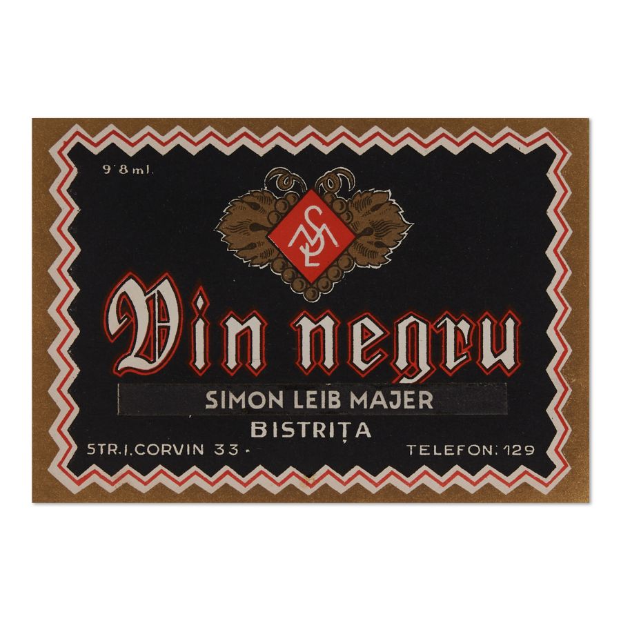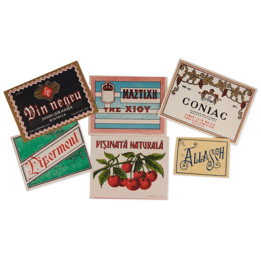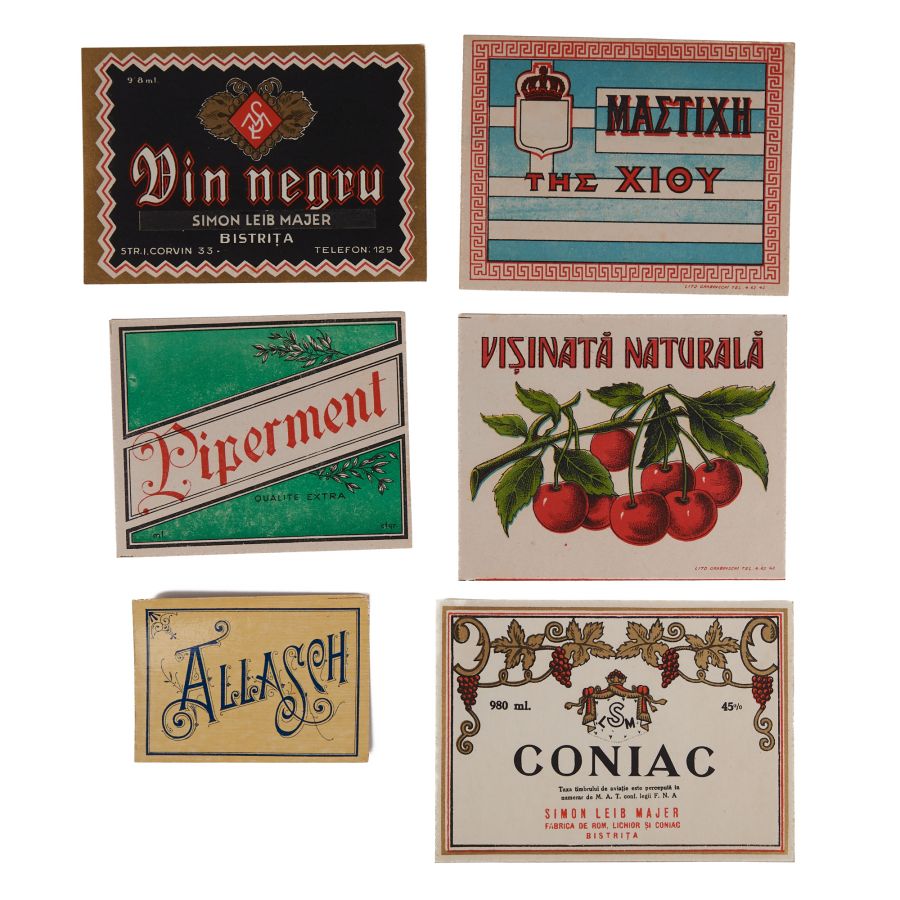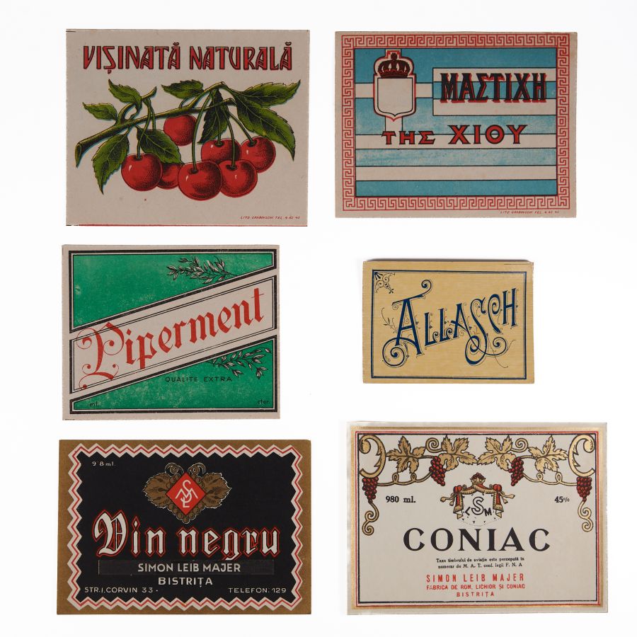 Colecție de șase etichete pentru băuturi alcoolice, printre care coniac și vin negru produse de Simion Leib Majer, Allasch, vișinată naturală, The Xioy, Piperment.