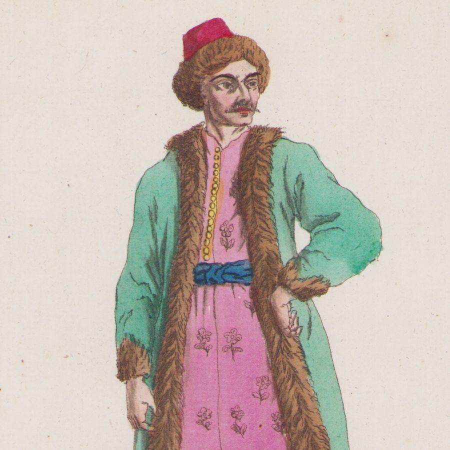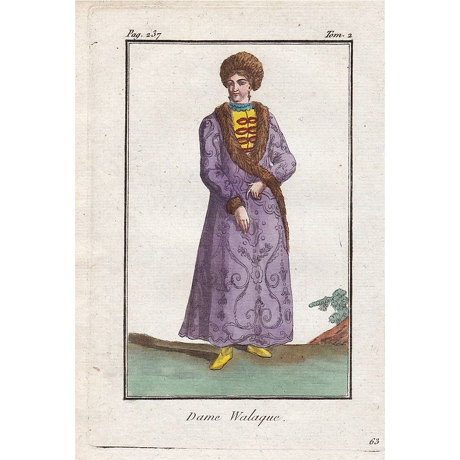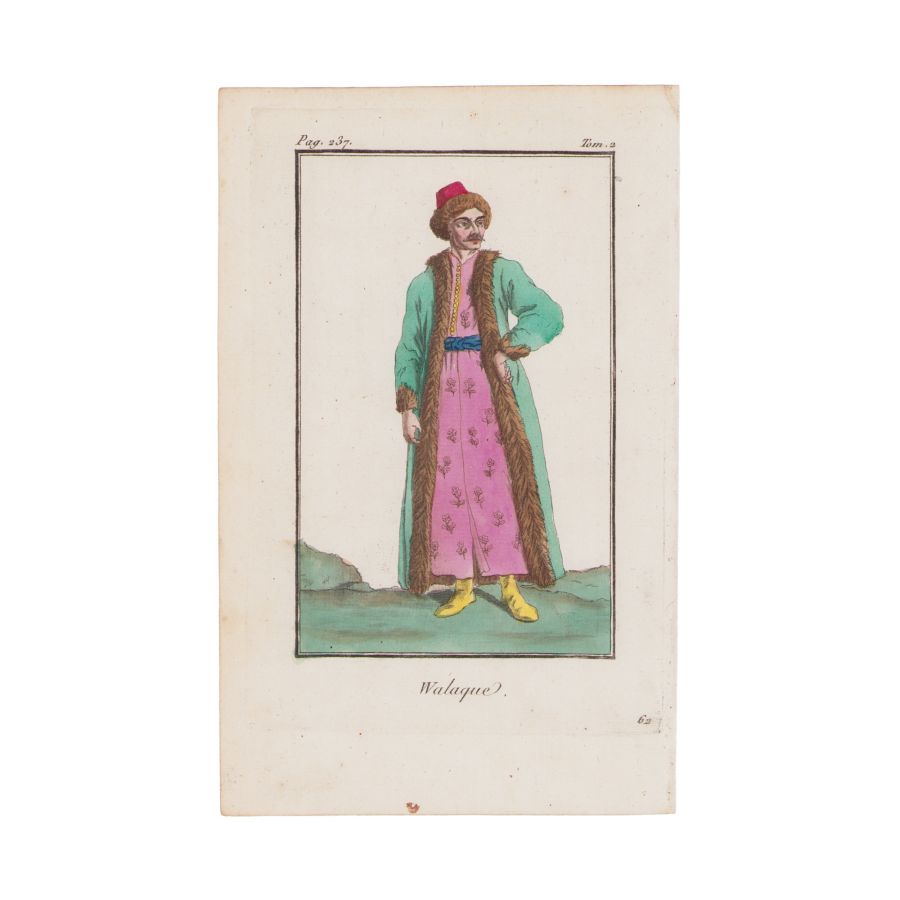 Două gravuri în cupru înfățișând un boier și o boieroaică din Valahia. Acestea au fost tipărite pe hârtie vărgată și au fost colorate manual în epocă. Cele două gravuri pot fi datate în secolul al XIX-lea.