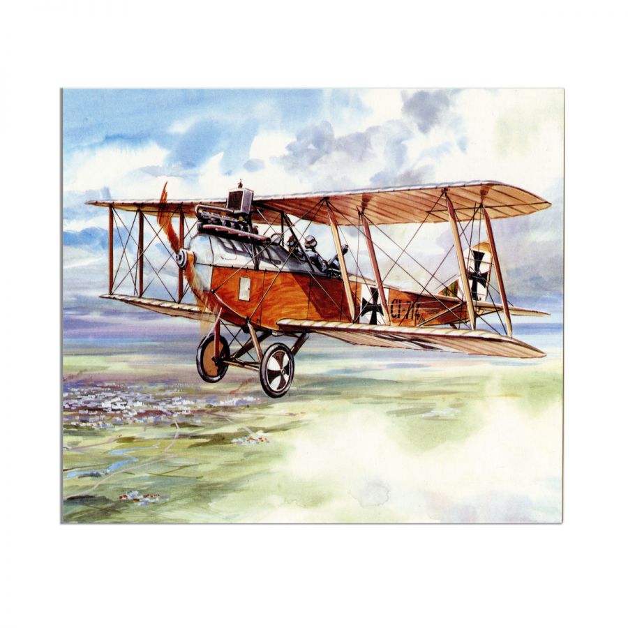 Carte poștală ilustrată cu un desen al avionul Hansa-Brandenburg c-1, aflat în serviciul armatei imperiale germane în timpul Primului Război Mondial. Cărțile poștale au fost tipărite de către poșta britanică pentru a aniversa 80 de ani de la finalul Marelui Război. Evenimentul comemorat de aceste imagini este Căderea Bucureștiului.
