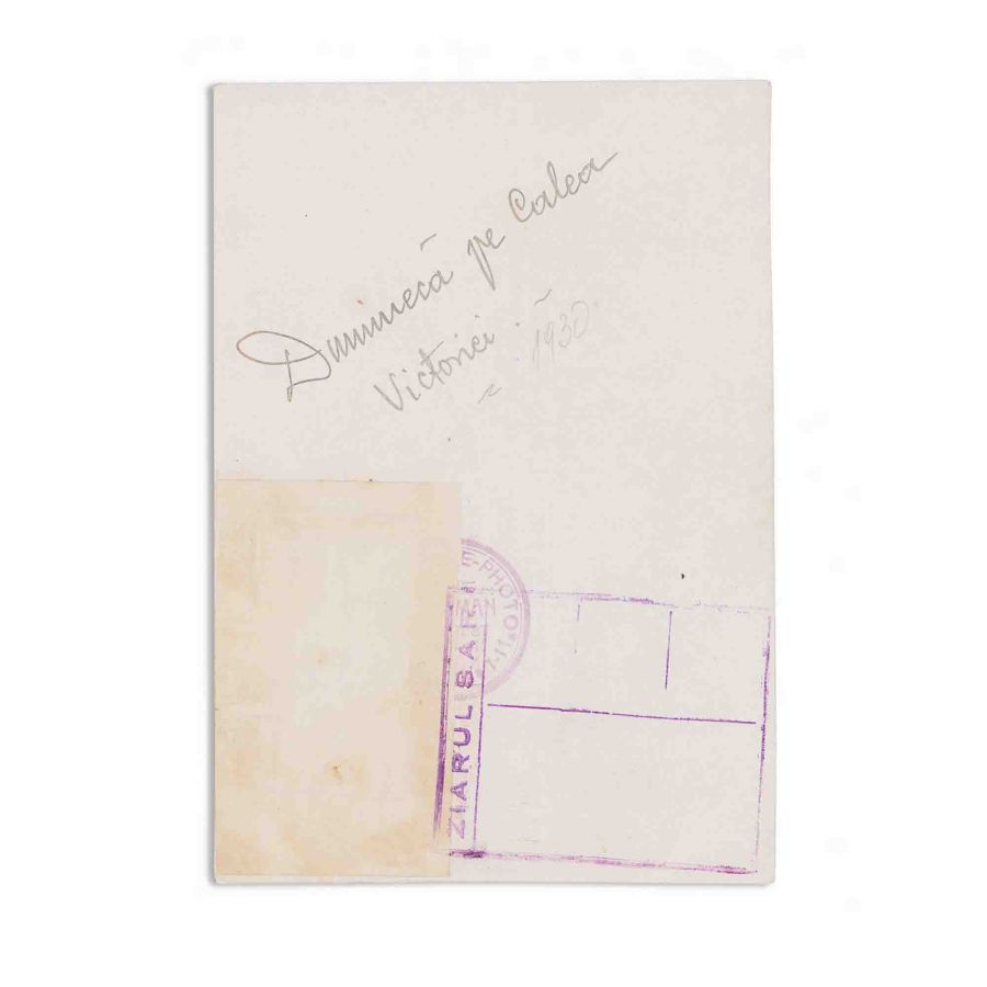 Fotografie de epocă ce înfățișează un cadru de pe Calea Victoriei. Aceasta poate fi datată în jurul anului 1930 și este realizată de fotograful I. Berman, conform ștampilei de pe verso.
