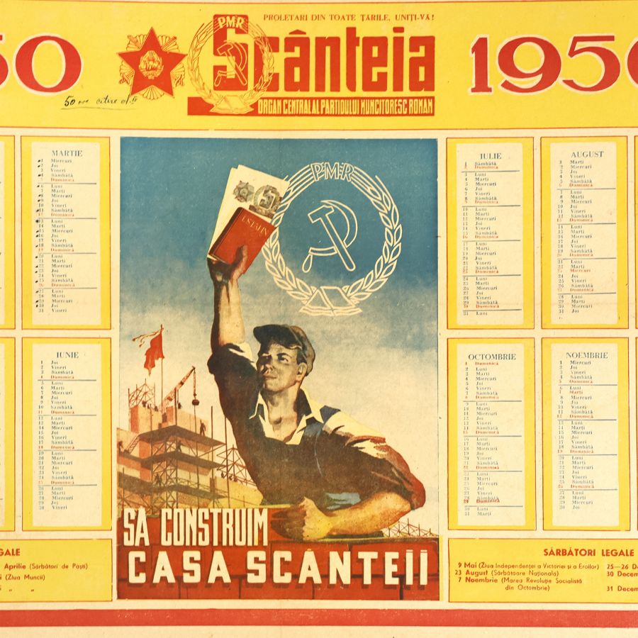 Calendar „Scânteia. Organ Central al Partidului Muncitoresc Român” pe anul 1950. Acesta este realizat în Institutul de Arte Grafice „Scrisul Liber”. Cu o ilustrație intitulată „Să construim Casa Scânteii”.