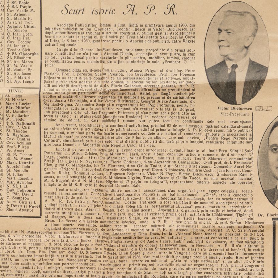 Calendarul Asociației Publiciștilor Români pe anul 1939, București, Tipografia „Excelsior”. Cu portretele consiliului central de conducere, printre care Nicolae Iorga.