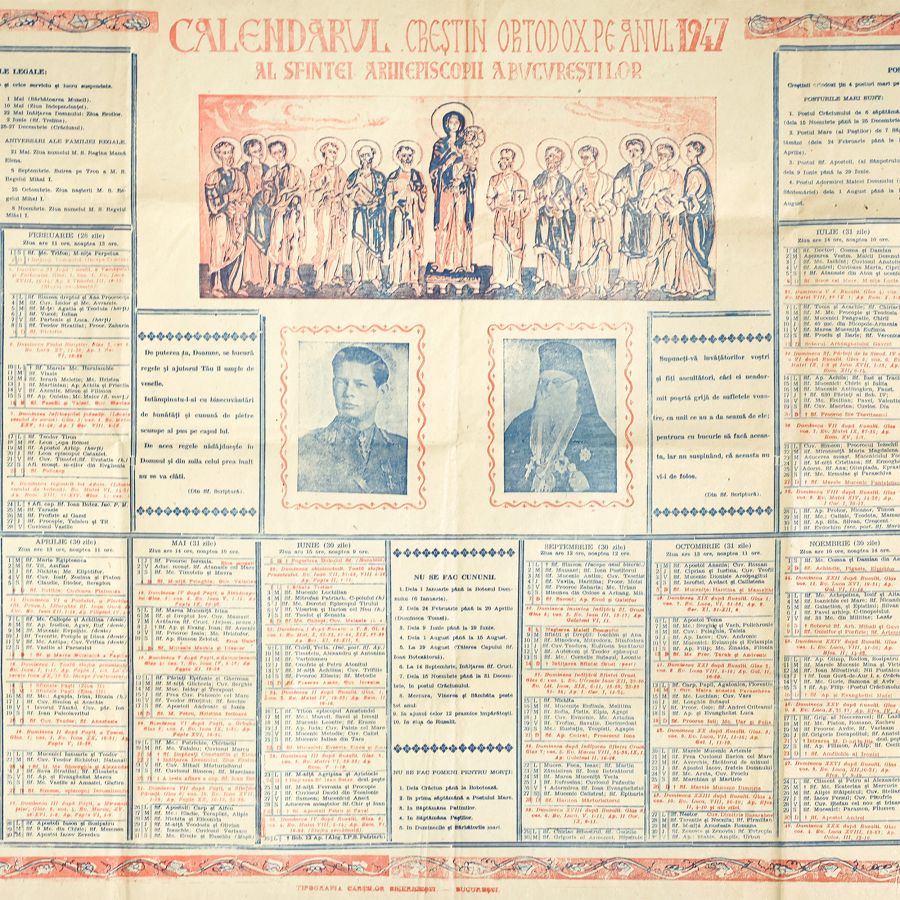 Calendarul Creștin Ortodox pe anul 1947 al Sfintei Arhiepiscopii a Bucureștilor, tipărit la București în Tipografia Cărților Bisericești. În centrul calendarului a fost tipărit un portret al regelui Mihai I alături de patriarhul Nicodim Munteanu.