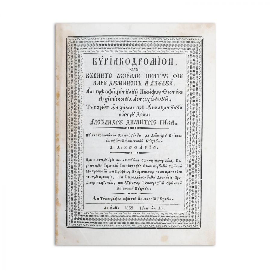 Kyriakodromion sau Cuvinte morale pentru fiecare Duminecă a anului. Ale Preasf(i)nțitului Nichifor Theotoke Arhiepiscopul Astrahanului. Tipărit în zilele prea Înălțatului nostru Domn Alexandru Dimitrie Ghica. Cu blagosloveniia iubitoriului de D(u)mnezeu Episcop al sf(i)ntei Episcopii Buzăul, D. D. Chesarie. Prin stăruirea și cheltuiala sfințiilor sale, Părintelui Ierotheiu Inspectorul Seminarului Sf(i)ntei Mitropolii (...) și a Ierodiaconului Dionisie Profesor național, și Director Tipografii Sf(i)ntei Episcopii Buzăul. În Tipografiia Sf(i)ntei Episcopii Buzăul la anul 1839, iulie în 15. [4] f., 479 p. (cu signat.) ; il. ; 4° (23 cm.), 33 R (18 x 13 cm.)