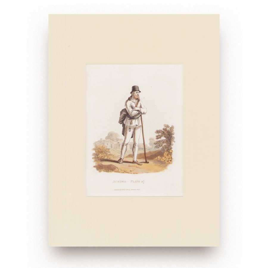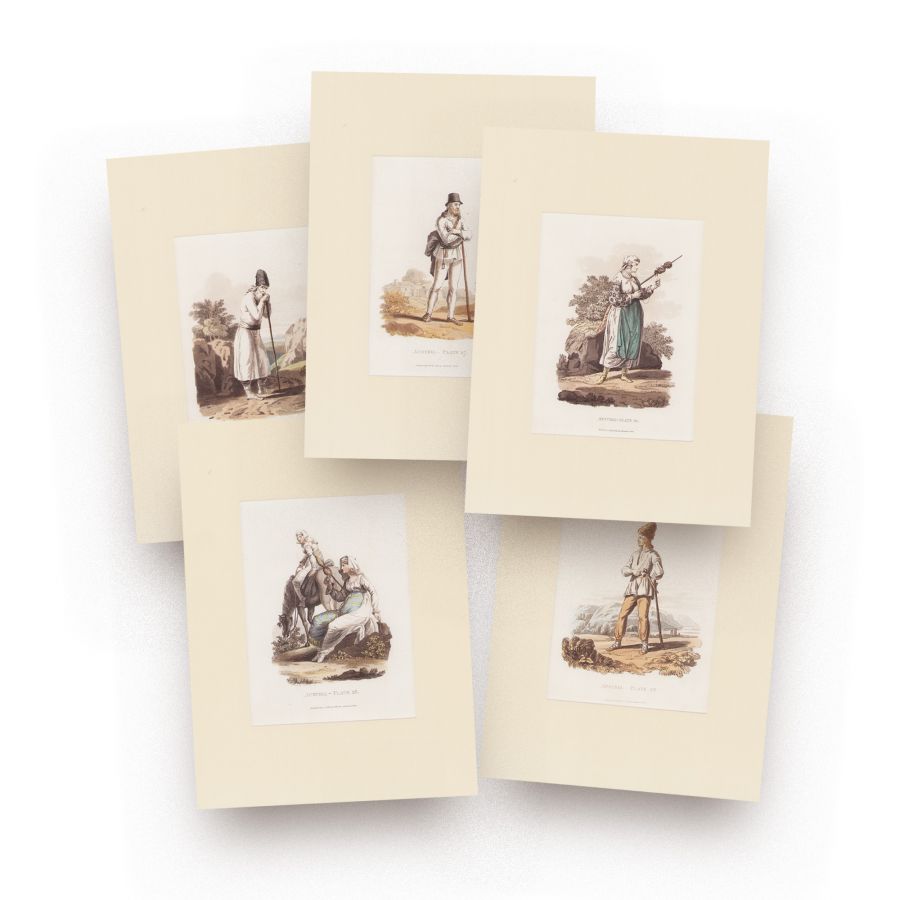 Cinci gravuri de epocă din seria „The Costume of the Hereditary States of the House of Austria” [Costumul din statele ereditare din monarhia Austria] de William Miller. Acestea au fost realizate de gravorul William Ellis, în anul 1813. Sub fiecare imagine regăsim numele editorului „Published June 1813 by J. Murray Albernale Street". Pe verso, cu creionul sunt trecute, în limba engleza, titlurile gravurilor și a fost ștampilat numele colectionarilor.