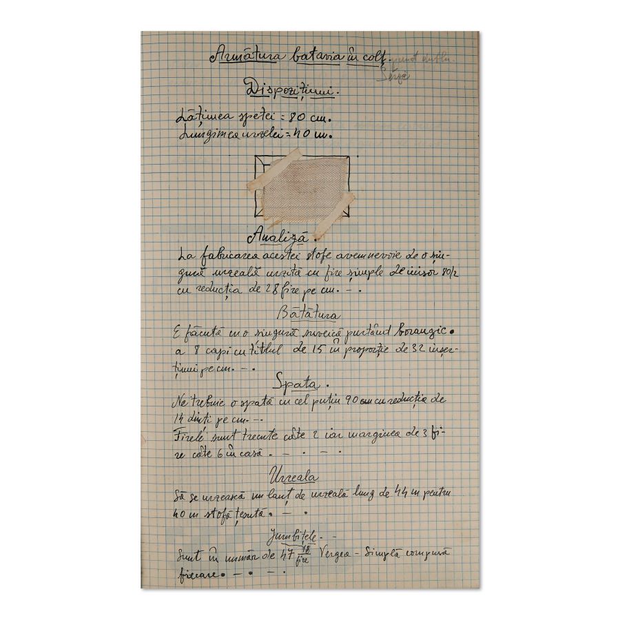 Acesta era destinat materiei Teoria țesutului după cum putem vedea pe legătură. Conținutul caietului cuprinde lecții redactate olograf de elevă despre istoria țesutului, urzitorul de lână, noțiuni generale despre modul de a țese, descrierea războiului, toate acestea venind însoțite de scheme, dar și mostre de material inserate în text. Caietul este redactat cu cerneală neagră și prezintă corecturi ale profesorilor, iar pe prima pagina semnătura doamnei director.