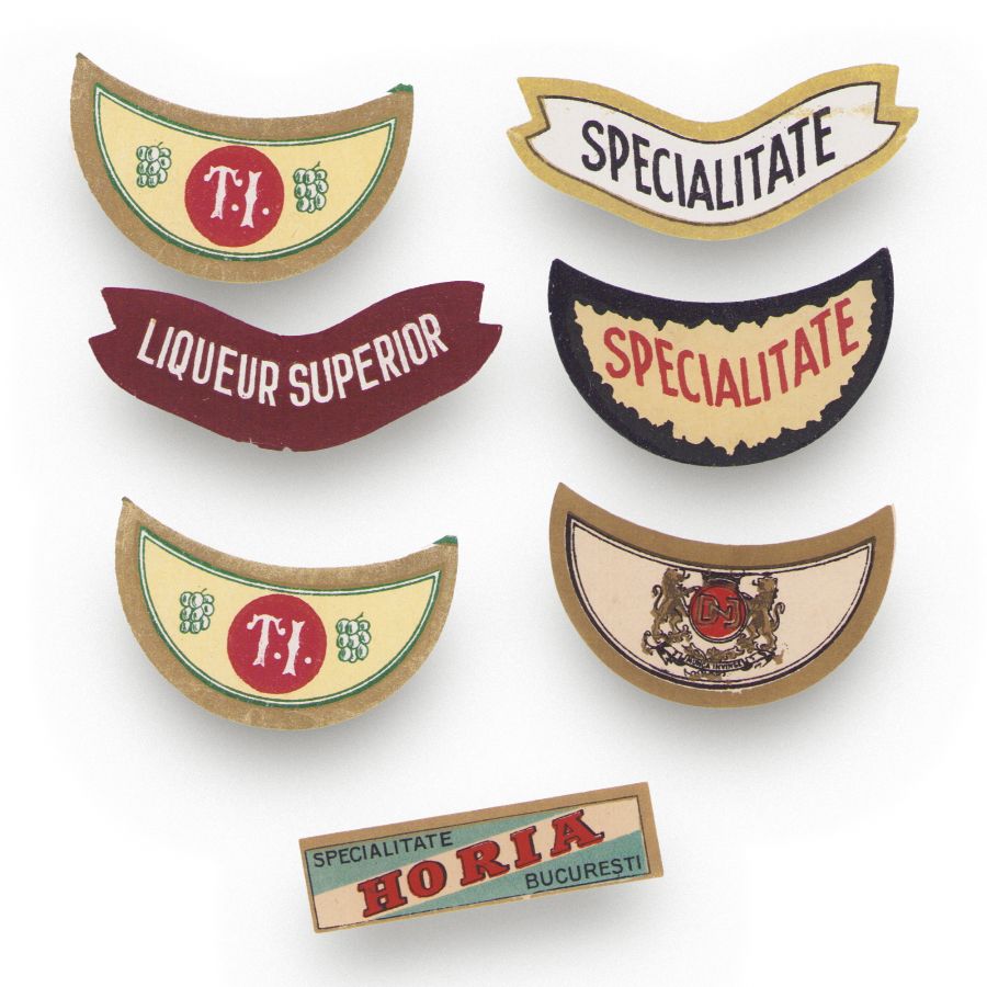 Colecție de 31 de etichete pentru băuturi: vin, liqueur, șampanie, oțet. Etichetele aparțin unor mărci diverse precum: Podgoria Rahovei, Cristofor Ionescu Trofică, Petre A. Ulidescu, C. Nistor, Cezar Filipescu.
