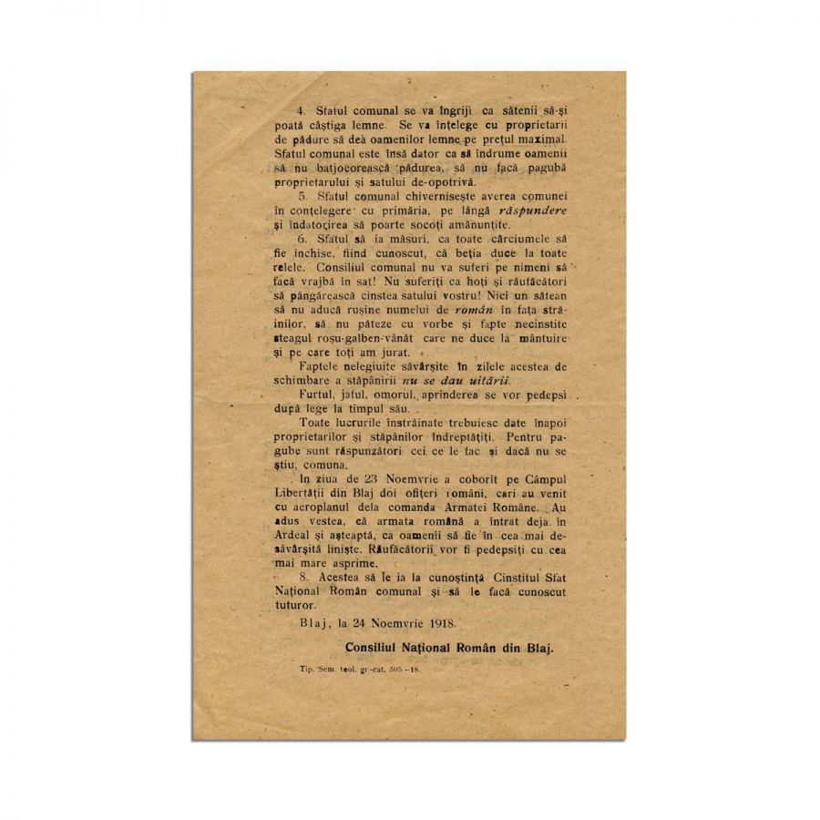 Consiliul Național Român din Blaj, comunicat prin care populația era îndemnată să respecte regulile civice impuse de Sfatului Național din fiecare comună, deoarece armata română ajunsese deja în Ardeal. Mesajul a fost emis în 24 noiembrie 1918.