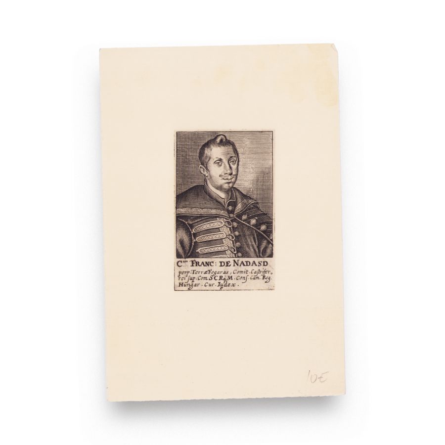 Gravură în cupru pe hârtie vărgată, înfățișându-l pe contele Ferenc II Nádasdy, intitulat sub imagine: Com Franc de Nadasd per. Terrae Fogaras Comit(atus) Castriferrei sup[remus] Com[es,] S[acrae] C[aesareae] R[egiae]q[ue] M[aiestatis] Cons[iliarius,] Cam[erarius,] Reg[ni] | Hungar[ici] Cur[iae] Iudex. Aceasta a fost realizată de Mathias von Somer. Gravura a fost decupată dintr-o planșă cu 9 portrete din Martin Meyer „Ortelius Continuatus" Das ist Der Ungarischen Kriegs=Empörungen Fernere Historische Beschreibung Oder Zweyter Theil, lucrare editată la Nürnberg de Paul Fürst în anul 1665.