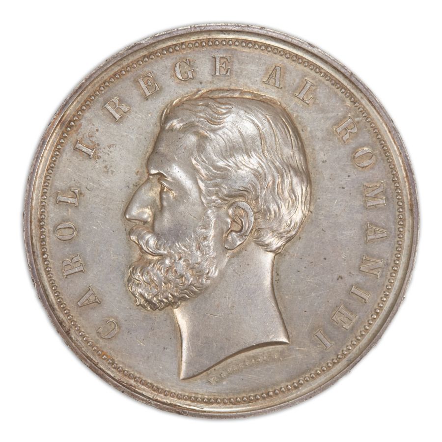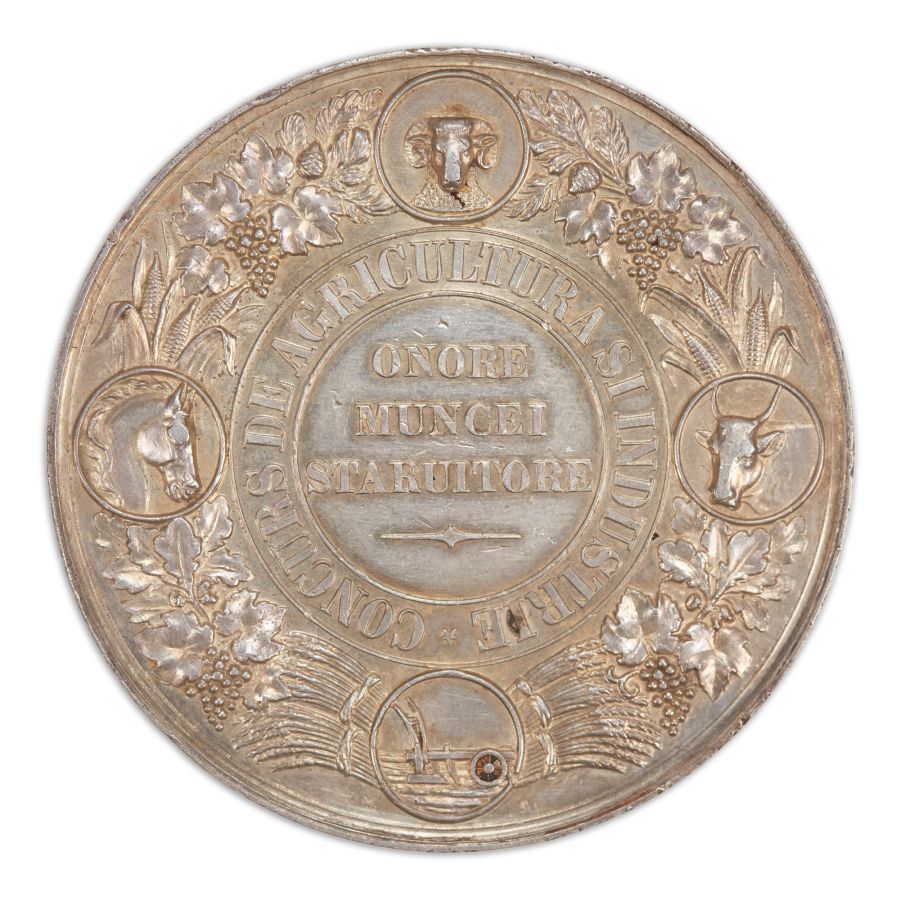 Medalie din argint oferită drept premiu în cadrul Concursului de Agricultură și Industrie. Pe avers regăsim efigia regelui Carol I, iar pe revers sunt reprezentate câteva elemente specifice agriculturii, precum vița-de-vie, porumbul, grâul, cât și animale.