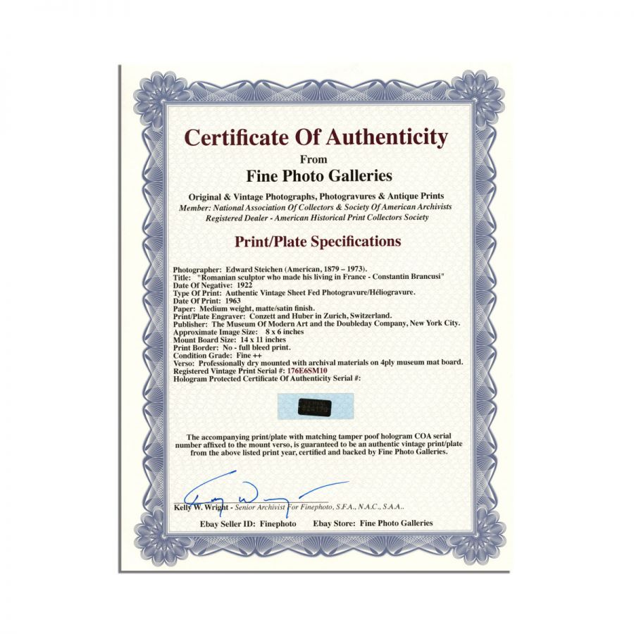 Fotografie realizată în 1963 după un clișeu original de Edward Steichen din 1922 ce îl înfățișează pe sculptorul Constantin Brâncuși îmbrăcat cu halatul de lucru peste costumul obișnuit, pozând în fața unui bloc de piatră.