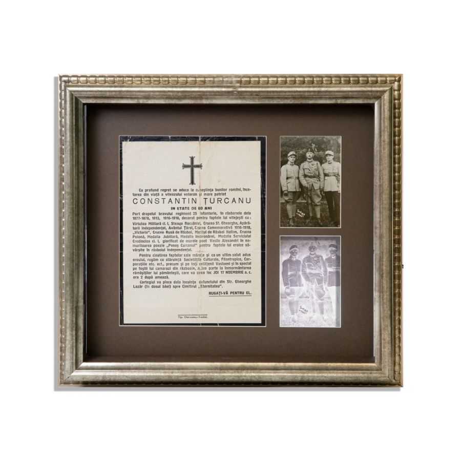 Fotografie de epocă în care este înfățișat Constantin Țurcanu, purtând lenta Regimentului VII Racova Nr. 25, alături de doi subalterni militari, ce făceau parte din același regiment, conform particularităților uniformei. Fotografia a fost realizată la Govora, în anul 1923, atelier fotografic necunoscut. Se păstrează și clișeul fotografic original din celuloid.