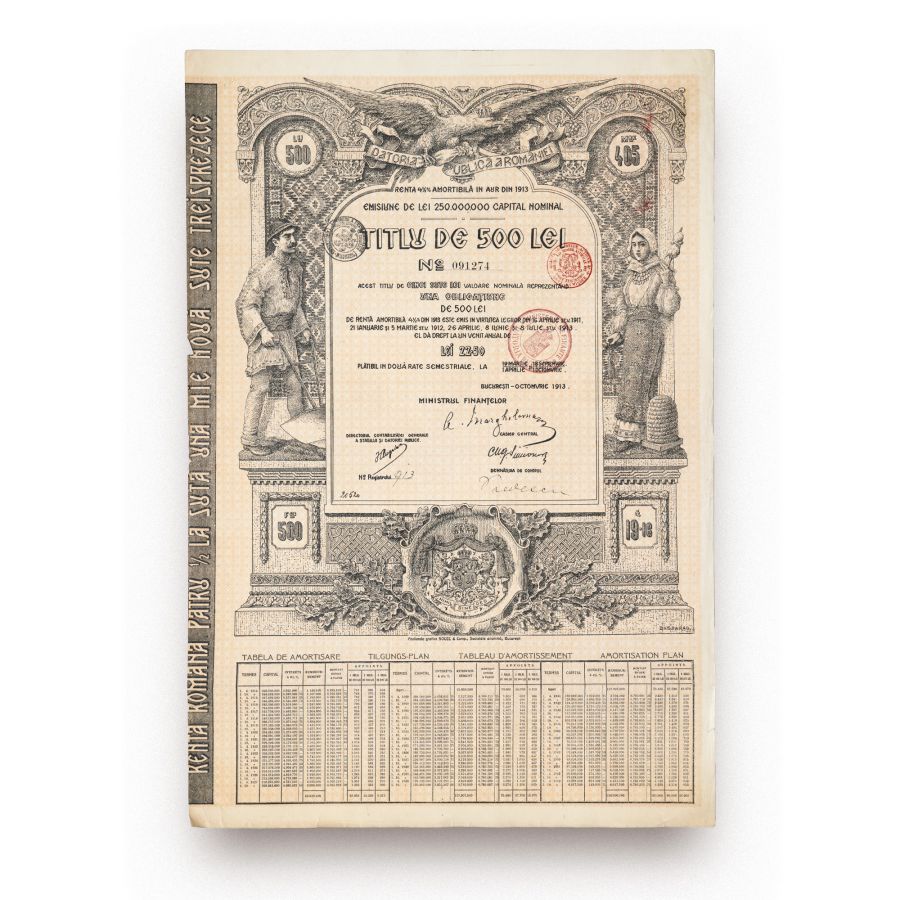 Titlul de 500 lei valoare nominală reprezentând o obligațiune de rentă amortibilă 4,5% a Datoriei Publice a României. Aceasta este datată 1913 și poate fi plătită în două rate semestriale.