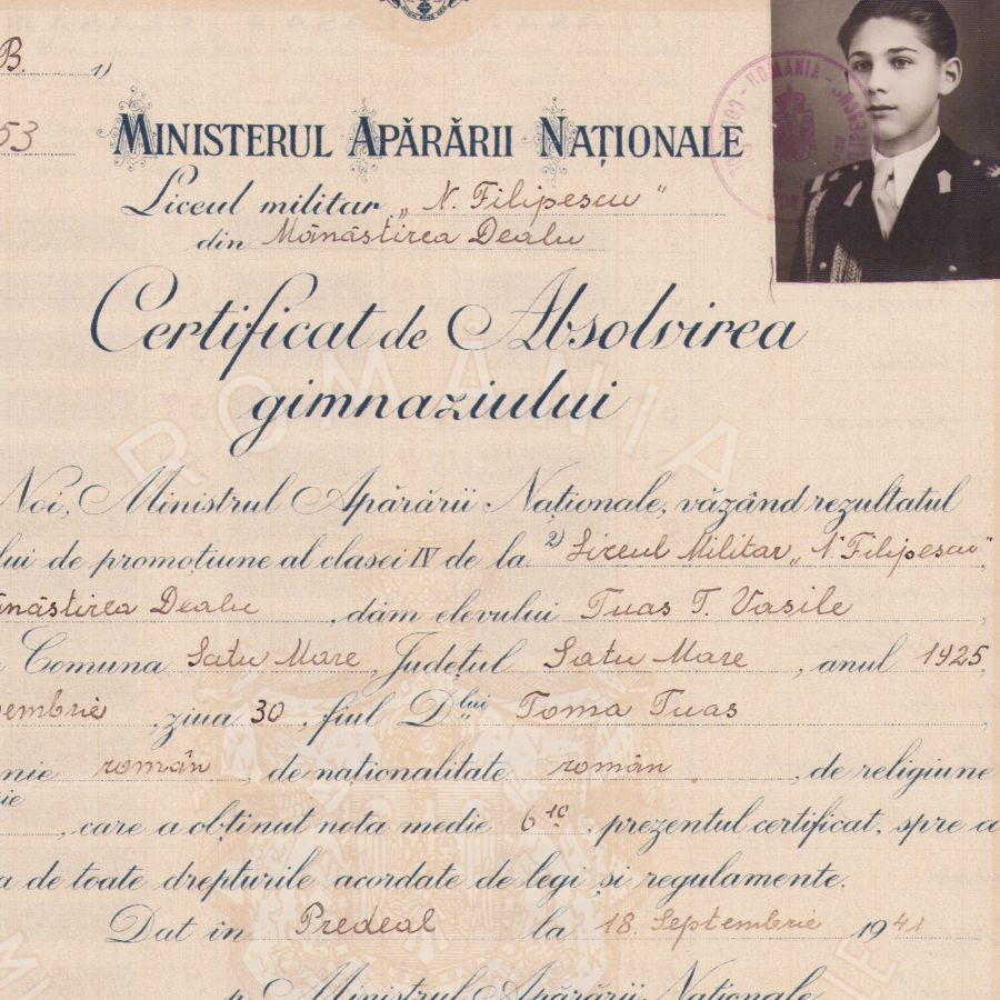 Certificat de absolvire a gimnaziului oferit lui Tuas T. Vasile, elev al Liceului Militar „N. Filipescu” din Mănăstirea Dealu. Acesta este datat 18 septembrie 1941 și poartă fotografia posesorului.