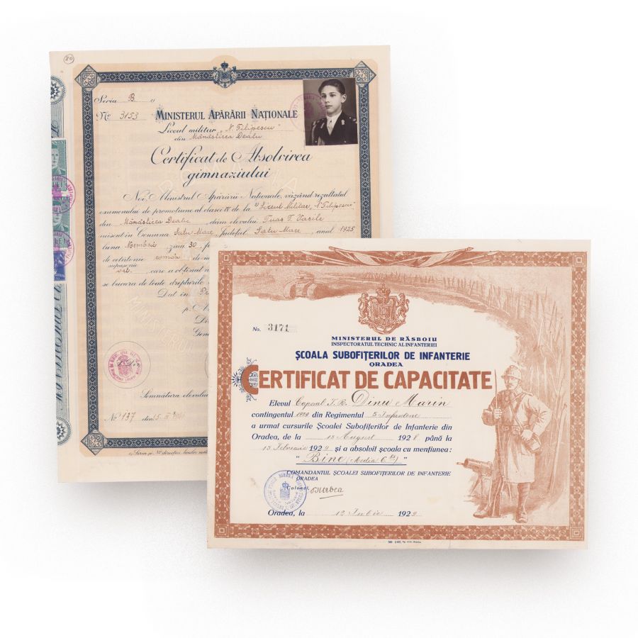 Certificat de capacitate oferit caporalului Dinu Marin, elev a Școlii Subofițerilor de Infanterie, care a urmat cursurile în perioada 15 august 1928-15 februarie 1929. Aceasta este datată 12 iulie 1929.