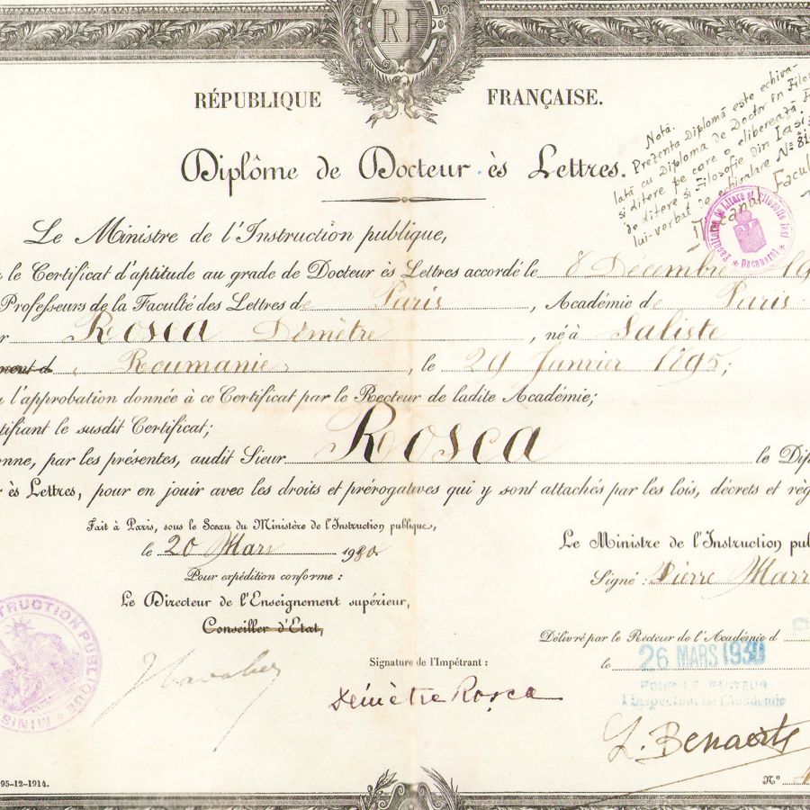 Diplomă de doctor în litere eliberată de Facultatea de Litere a Academie de Paris lui Dumitru D. Roșca.
