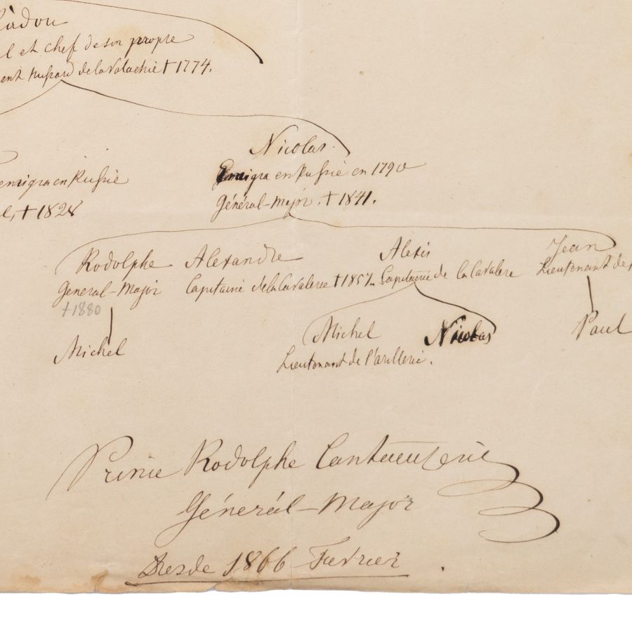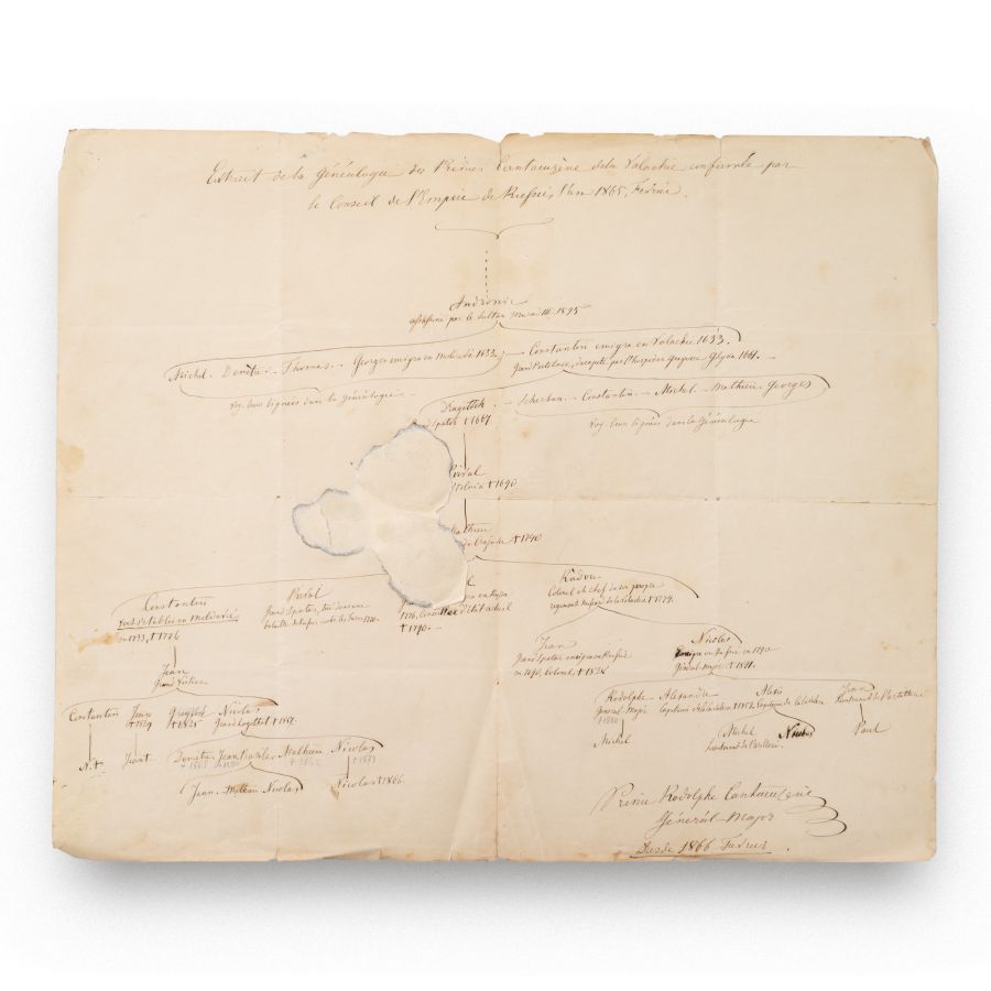Extras din Genealogia prinților Cantacuzino a Țării Românești, în conformitate cu Consiliul Împăratului Rusiei din februarie 1865. Primul nume menționat la începutul extrasului arborelui este cel al lui Andronic Cantacuzino (n. 1553 – d.1601), cu doar patru urmași menționați: Mihai, Dimitrie, Toma, Constantin. Pe linia lui Constantin Cantacuzino (n. 1598 – d. 1663) mare postelnic și dregător la curtea lui Matei Basarab, arborele continuă cu urmașii acestuia: Drăghici, Șerban, Constantin, Mihail, Matei, George. De la Drăghici Cantacuzino (n. 1630 – d. 1667), boier în Țara Românească, ajungem la primul său fiu Pârvu, care a murit conform extrasului în anul 1690. Acesta din urmă avut un fiu, care a purtat tot numele de Pârvu (n.1689 - d.1751). De la acesta din urmă ajungem la Matei Cantacuzino (d. 1740), unul dintre cei doi fi al lui Pârvu. Matei a avut patru urmași: Constantin, Pârvu, Radion, iar cel de-al patrulea este ilizibil. Spre final arborele se împarte în doar două ramuri. Prima este cea a lui Constantin (d.1761/76) continuată de Ioan (1756–1828), de copii acestuia: Constantin, Ioan, Grigore, Nicolae (1790–1857), iar apoi de copii acestuia din urmă: Dimitrie, Ioan, Vasile, Matei, Nicolae. Cea de-a doua ramură este a lui Rodion [Radu] Cantacuzino (n.1725 - d. 1774), care i-a avut ca și urmași pe Ivan și Nicolae (n. 1761– d. 1841), acesta din urmă cu 4 urmași: Alexander, Alexei, Ivan și Rudolf/Rodion (1812–1880). Acesta din urmă ar putea fi chiar cel care a comandat în epocă extrasul arborelui genealogic, conform însemnării de la final, care conține numele lui și datare 1866.