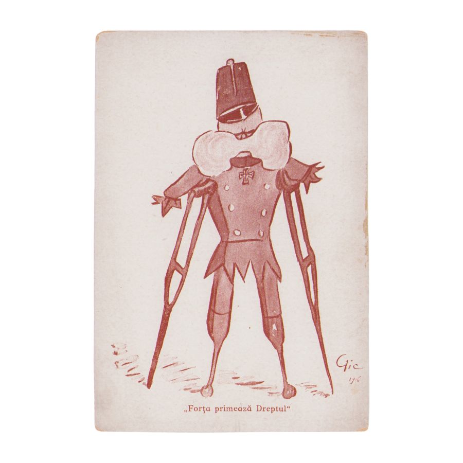 Carte poștală ce înfățișează caricatura împăratului Austriei, Franz Joseph, alături de zicala „Forța primează Dreptul”. Aceasta este datată 1916.