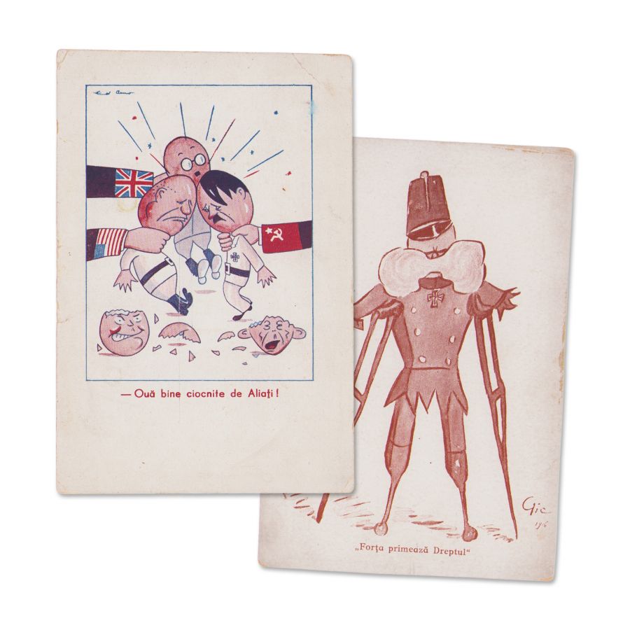 Carte poștală ce înfățișează caricaturile reprezentanților țărilor ce au luptat în al Doilea Război Mondial, printre care și Adolf Hitler. Ilustrația vine alături de mesajul „Ouă bine ciocnite de Aliați!”.