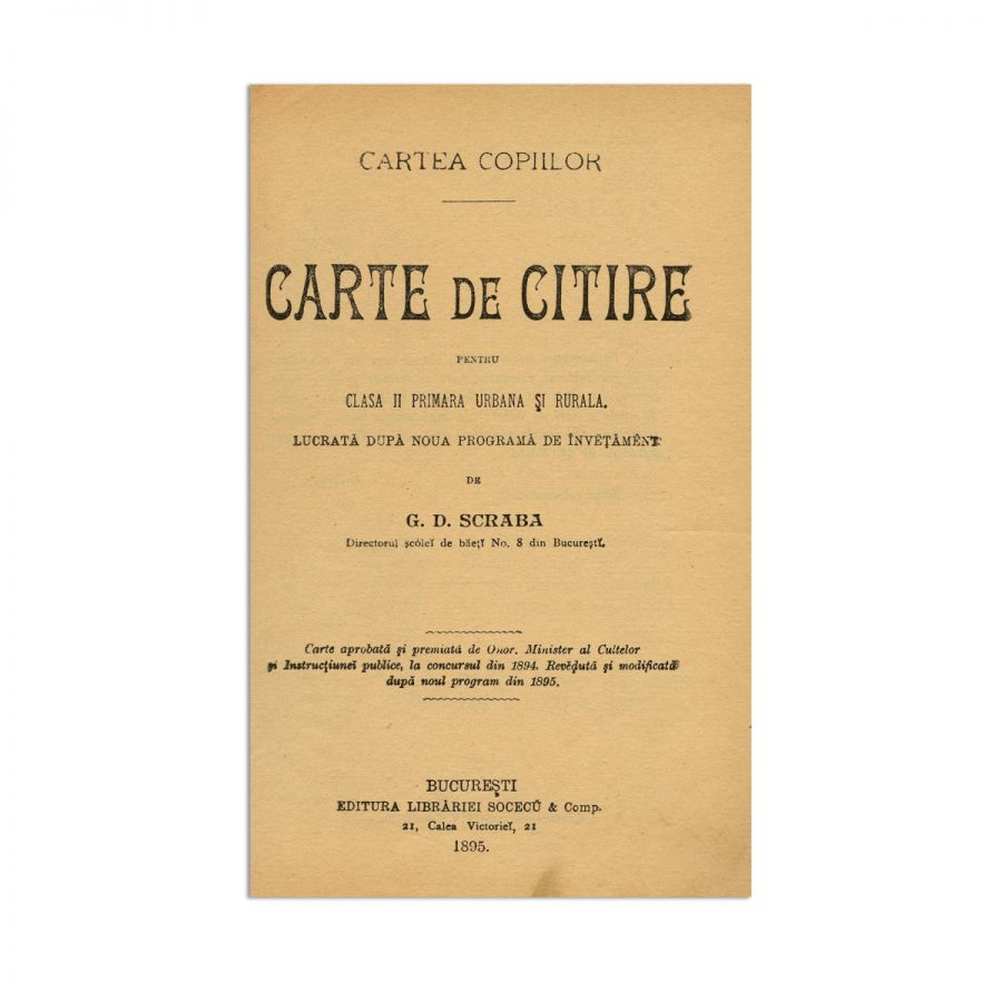 G. D. Scraba, Carte de citire pentru clasa II primară urbană și rurală, București, Editura Librăriei Socec & Comp., 1895. 229, V p. Cu numeroase ilustrații în interiorul textului.