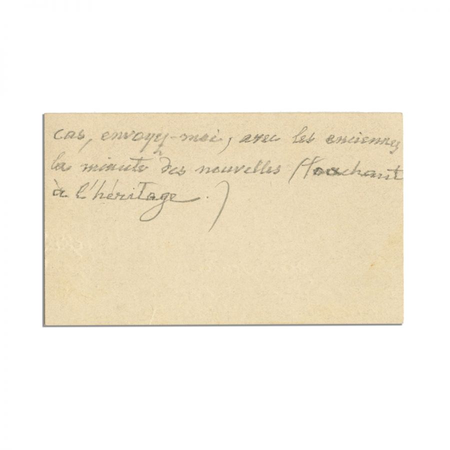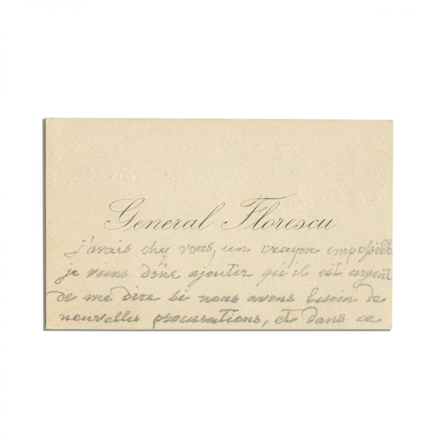 Carte de vizită ce a aparținut generalului Florescu. Aceasta păstrează o însemnare în limba franceză, redactată cu creionul.