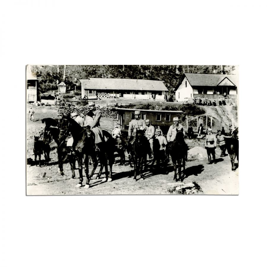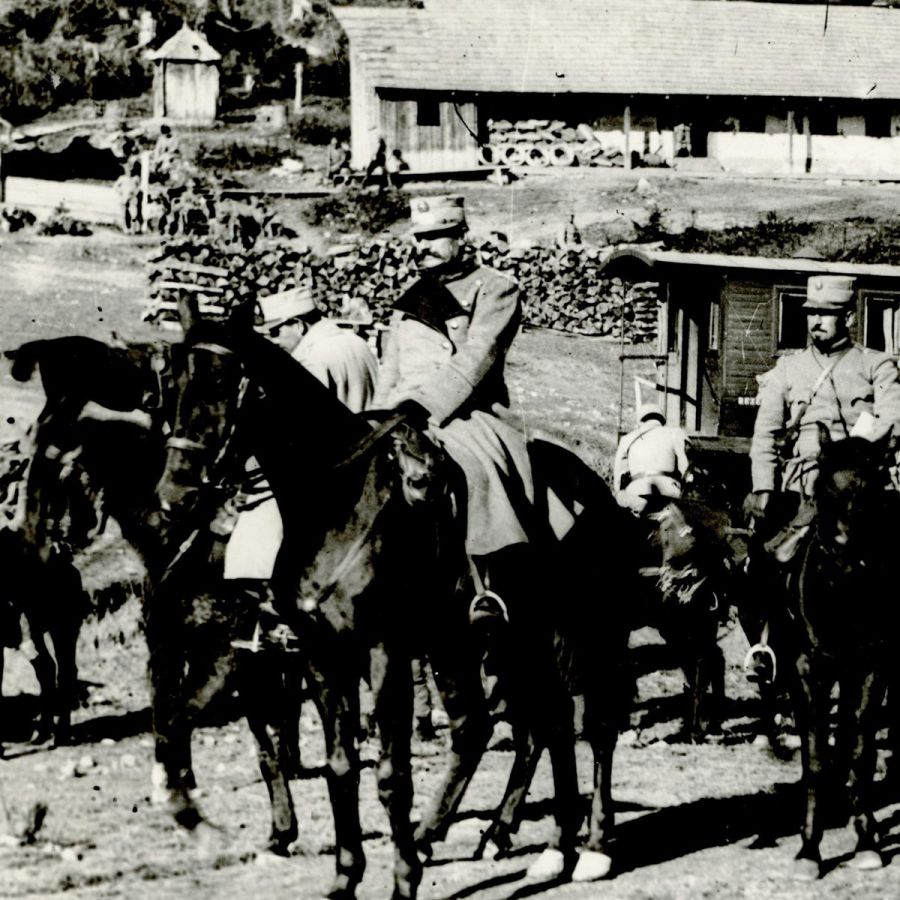 Fotografie de epocă în care este înfățișat Generalul Eremia Grigorescu călare pe cal, pe frontul de la Oituz, în toamna anului 1916.