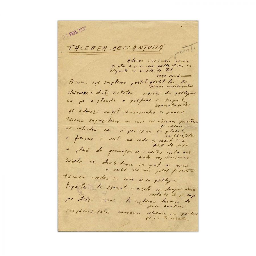 Manuscrisul unui poem scris de Geo Boza, fiind intitulat Tăcerea Deslănțuită. În deschiderea poemului regăsim câteva rânduri ce-i aparțin lui Sașa Pană: „Adesea îmi încerc vocea și știu o zi în care gâtlejul îmi va răspunde cu sunete de lut”. Poemul a fost redactat olograf, cu cerneală neagră, pe două pagini, fiind semnat olograf la final. Pe verso-ul ultimei pagini regăsim ștampila colecției lui Sașa Pană. Manuscrisul poate fi datat, conform ștampilei din antetul primei pagini 21.FEB.1931.