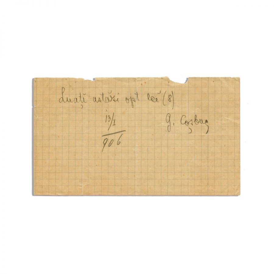 George Coșbuc, chitanță olografă valabilă pentru 8 lei. Biletul este redactat cu creionul pe o coală cu liniatură, fiind datat 13 ianuarie 1906 și semnat în final.