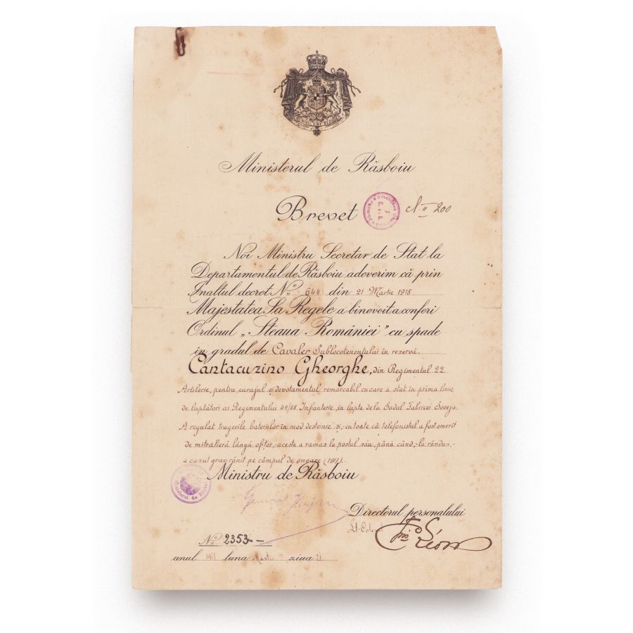 Brevetul ordinului „Steaua României” cu spade în grad de cavaler, acordat sublocotenentului în rezervă George Cantacuzino din Regimentul 22 Artilerie. Documentul a fost eliberat la 21 martie 1918.