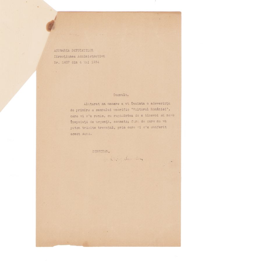 Brevetul însemnului onorific „Vulturul României” în grad de cavaler oferit deputatului M. G. Cantacuzino. Documentul a fost eliberat la 11 noiembrie 1933.