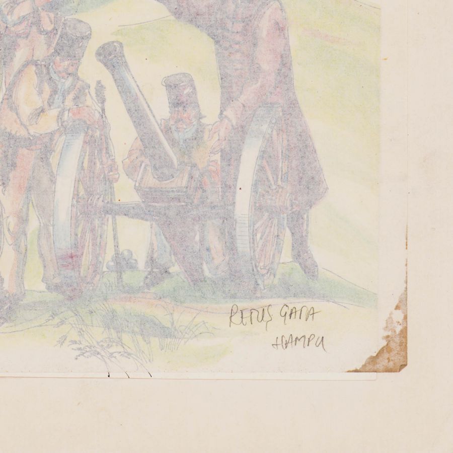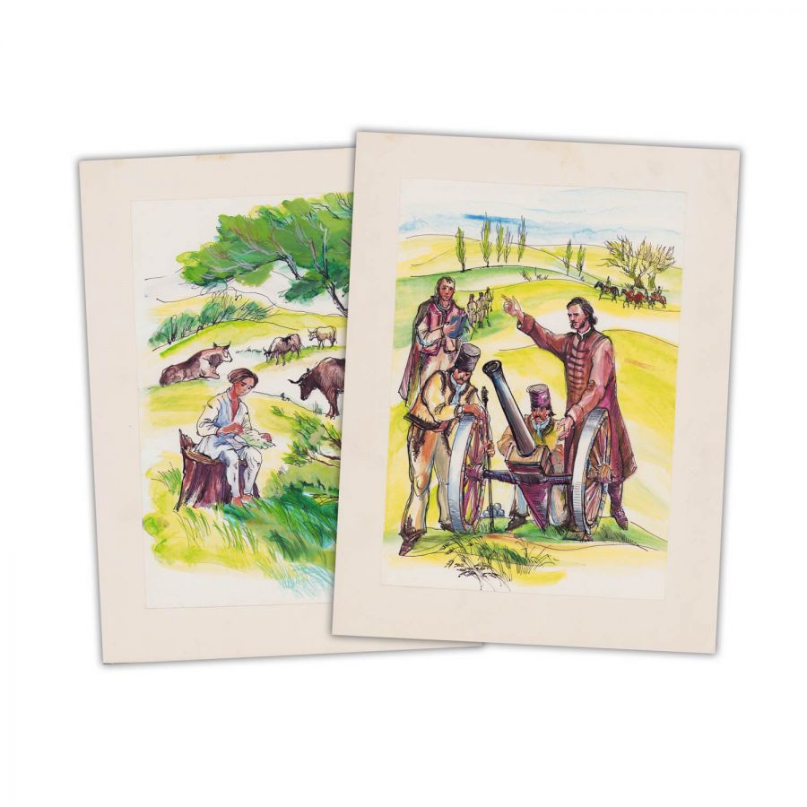 Două planșe realizate de Adrian Ionescu pentru volumul lui Gheorghe Alfiri, Torța peste veacuri, lucrare ce păstra inițial numele de Eroul din Vladimiri, ilustrându-i pe tunarii lui Tudor instruiți de Gheorghe Lazăr, respectiv pe Tudor Vladimirescu copil. Cele două planșe reprezintă ilustrația numărul 12 de la pagina 39, respectiv numărul 1 de la paginile 4-7. Pe verso regăsim detaliile tehnice, precum anul în care graficianul Adrian Ionescu a realizat ilustrațiile, 1988. Ilustrațiile au fost realizate în tempera și cariocă.