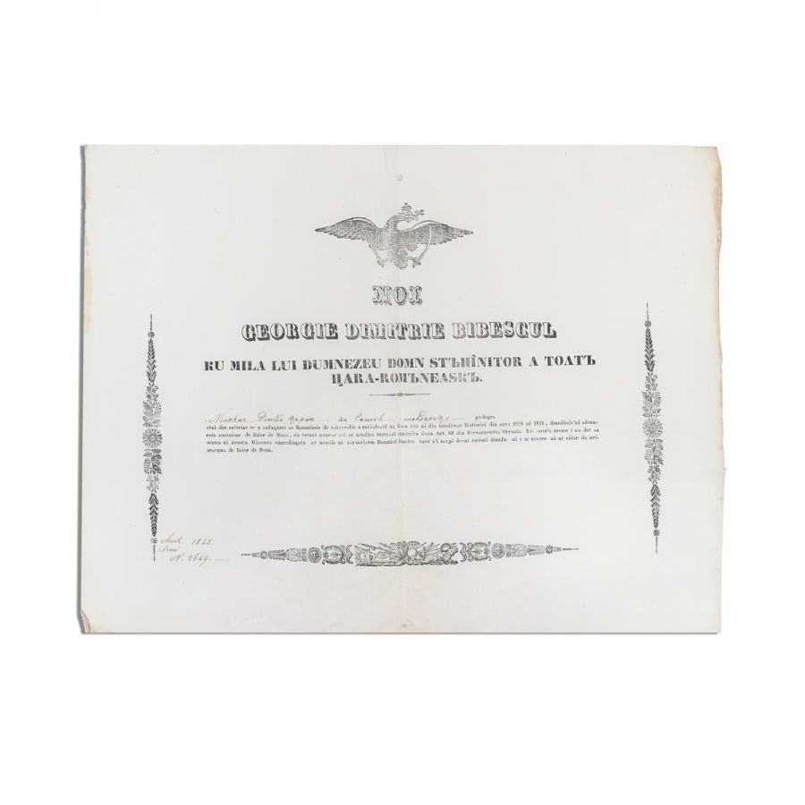 Diplomă de privilegii de „boier de neam” acordată de domnitorul Gheorghe Dimitrie Bibescu în conformitate cu prevederile Regulamentului Organic. Documentul poate fi datat 1845.