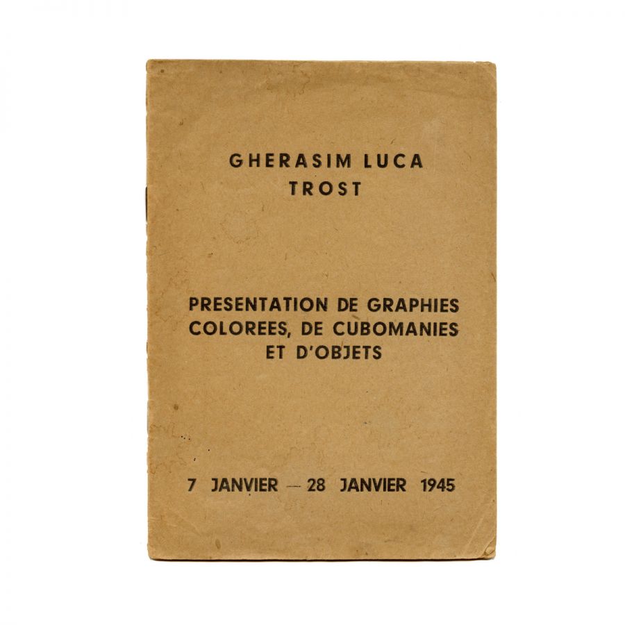 Gherasim Luca, Dolfi Trost, Presentation de graphies colorées, de cubomanies et d'objets [Prezentare de grafii colorate, de cubomanii și de obiecte], București, Imprimeriile „Independența”, 7 Ianuarie - 28 Ianuarie 1945.