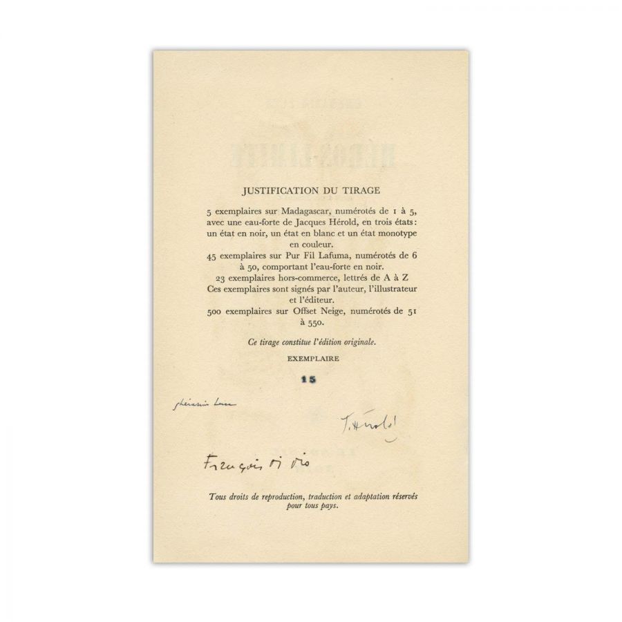 Cu trei desene de Jacques Hérold. Unul dintre desene este semnat olograf de Jacques Hérold, purtând numărul 15/50.
