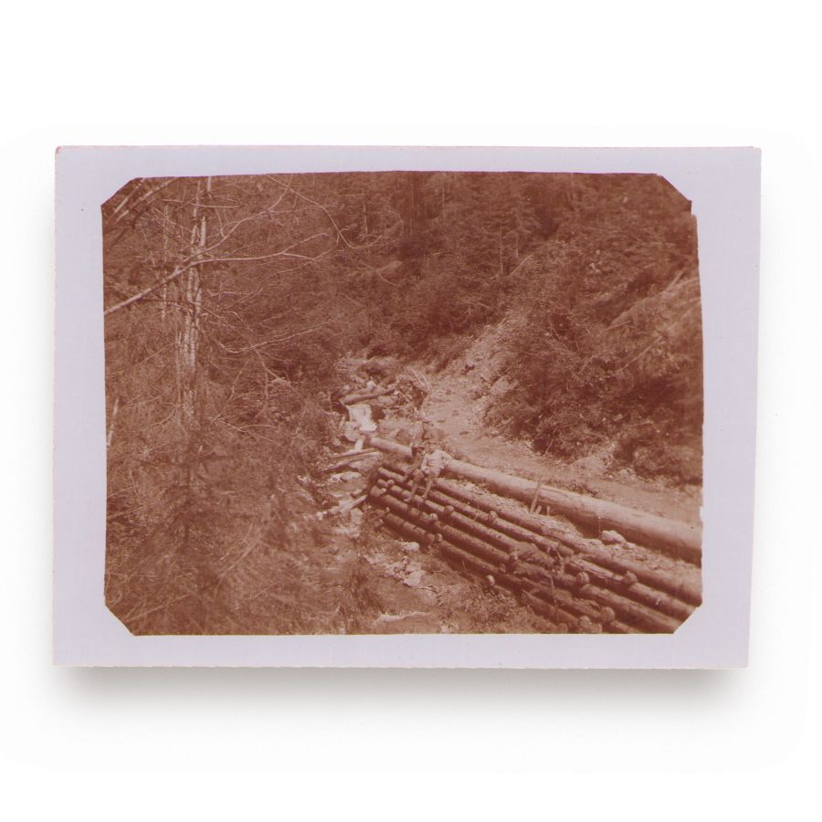 Colecție de cinci fotografii tip carte poștală care înfățișează grupuri de ruteni, din zona Bucovinei, lucrând la pădure, cărând bușteni pe rău sau păstorind turmele de vaci pe câmp.