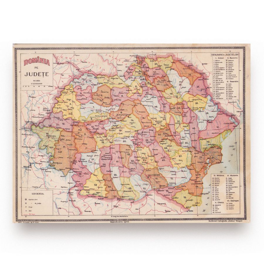 Harta României pe județe din anul 1923 realizată la o scară de 1: 250 000. Harta a fost gravată de V. Voill și litografiată de K. Dufka. Harta a fost tipărită în Institutul Cartografic „Unirea” din Brașov.
