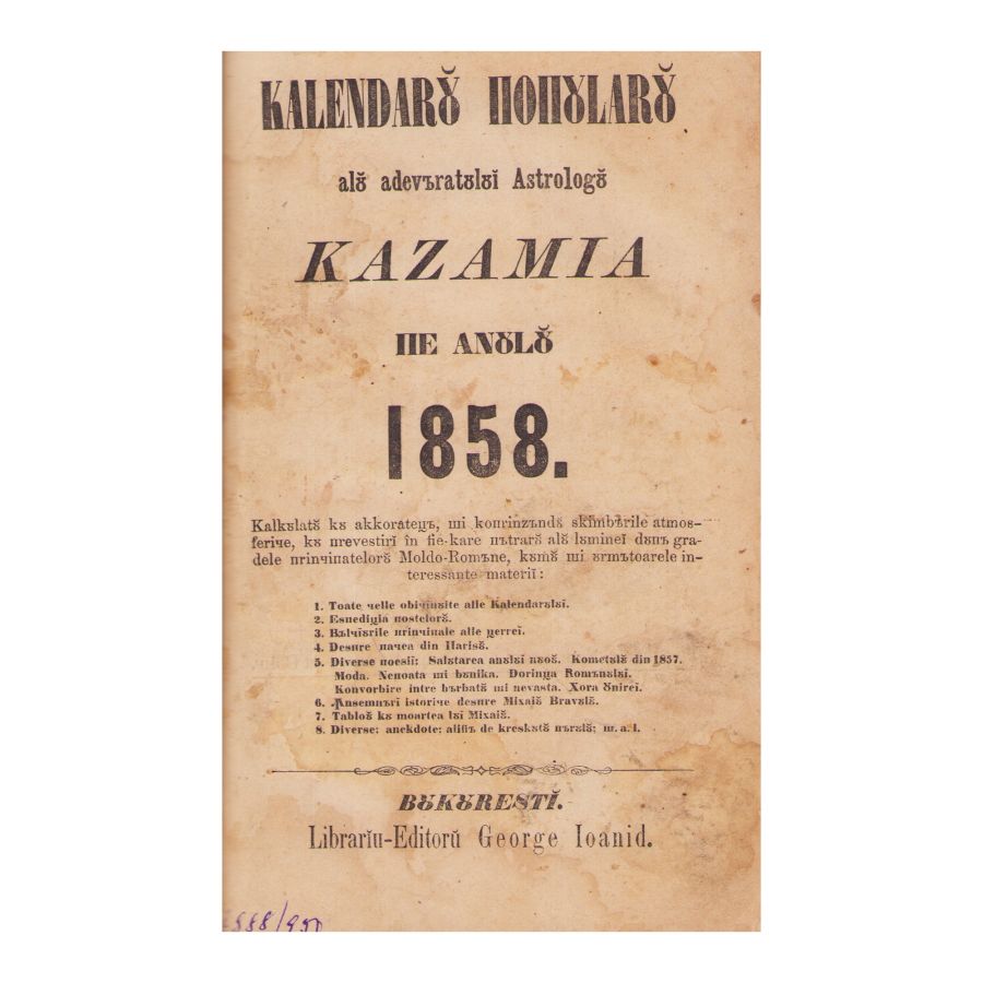 Calendaru popular al adevăratului astrolog Kazamia 1858, București, Librar editor George Ioanid, 118 p.