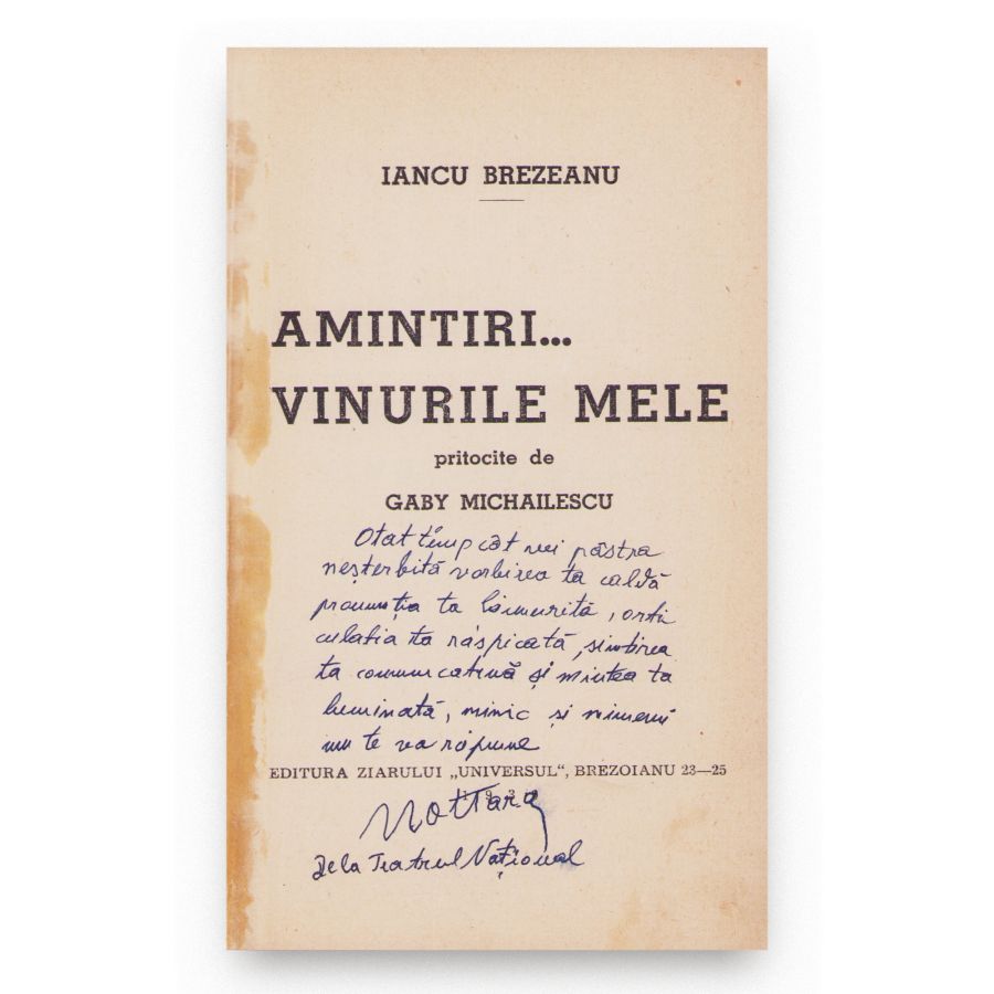 Iancu Brezeanu, Amintiri. Vinurile mele, 1939, cu dedicația lui Constantin Nottara