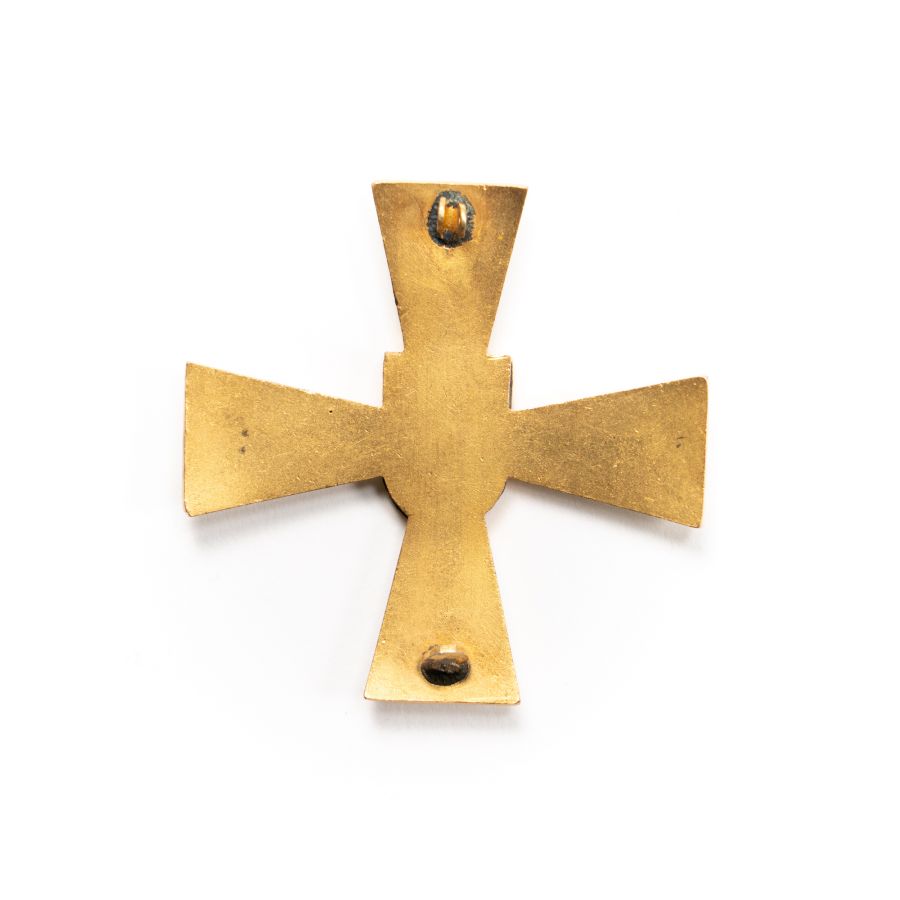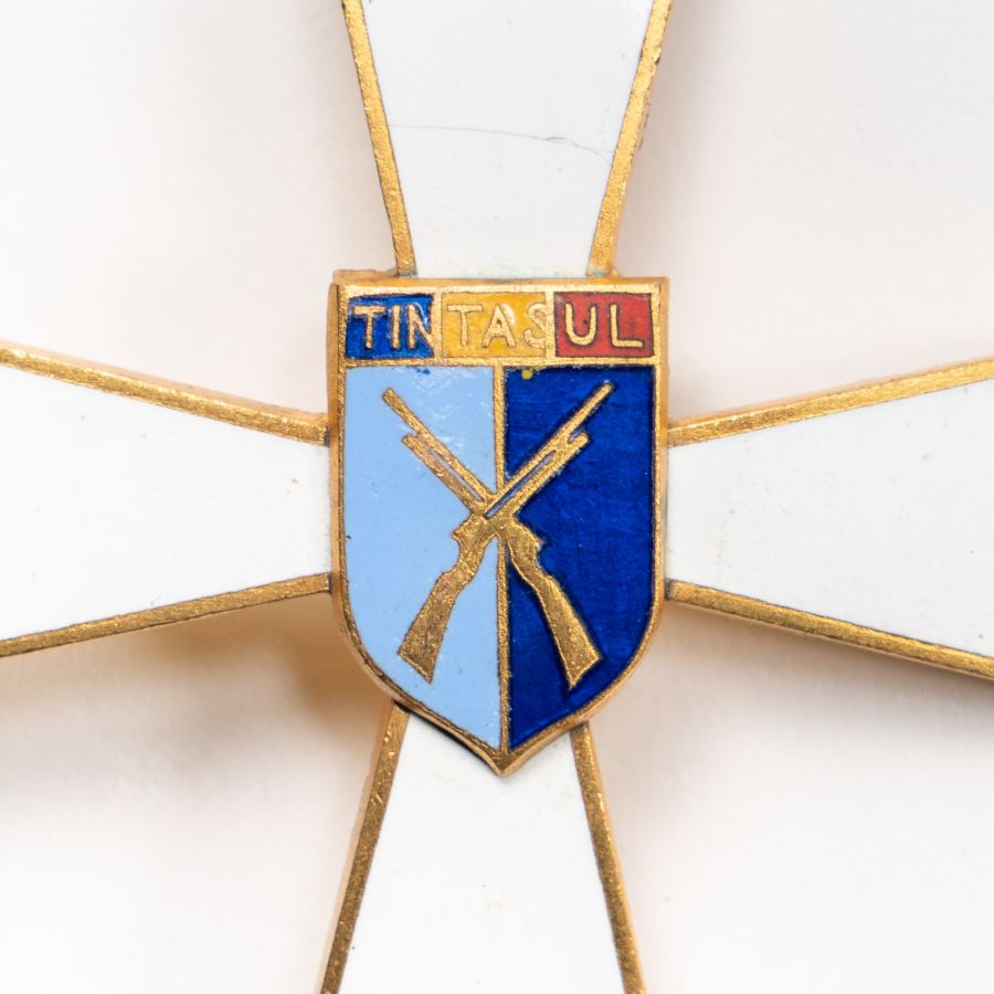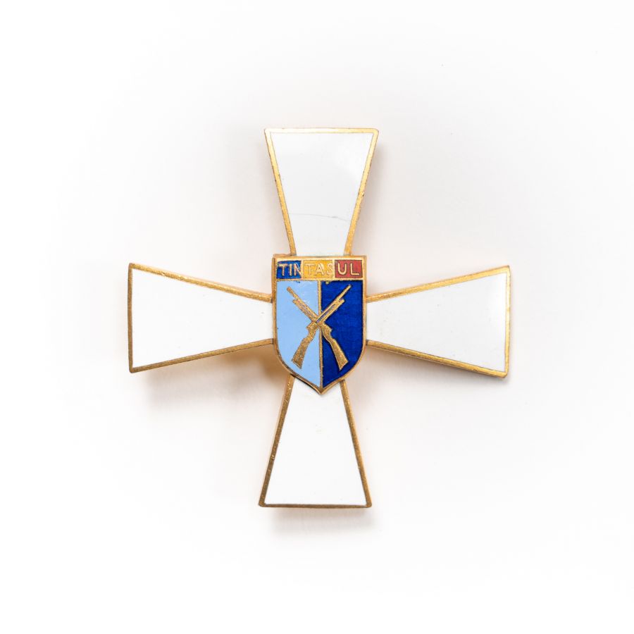 Insignă de țintaș, realizată din alamă și email sub forma unei cruci cu brațele egale în centrul cărora a fost reprezentat un scut despicat pe care au fost inscripționate două arme încrucișate.